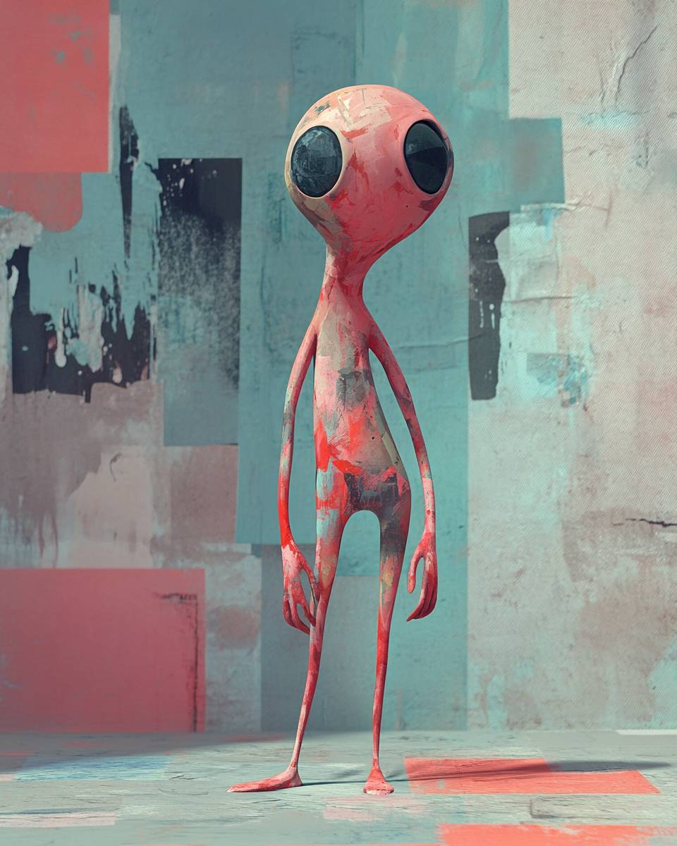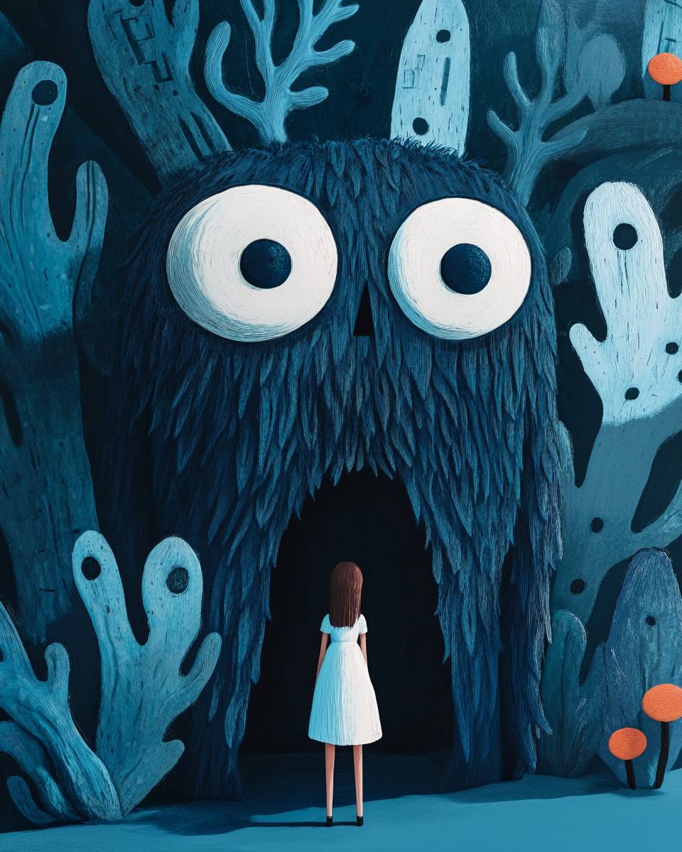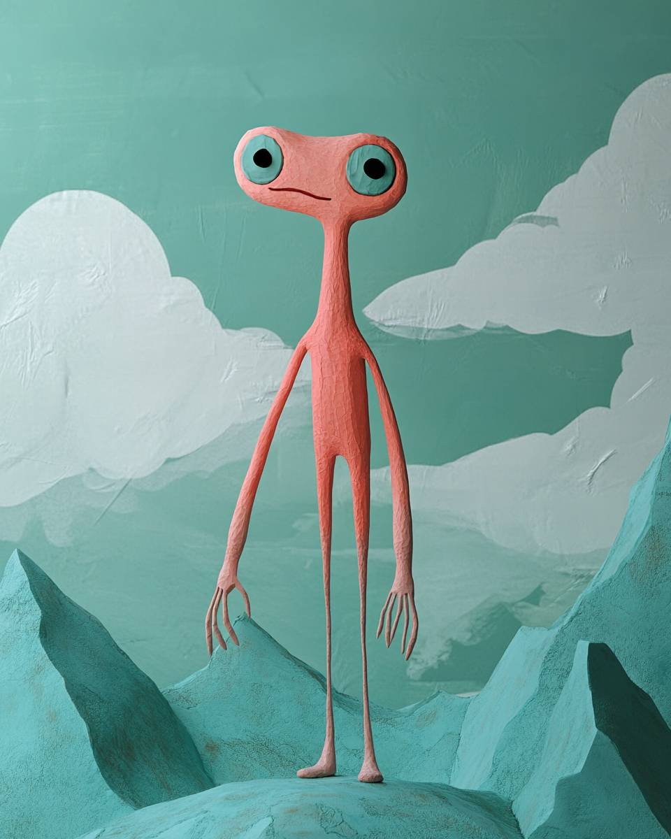 Uma criatura em 3D que mistura Jean Jullien e Isabelle Arsenault com um fundo de Kim Jung Gi.