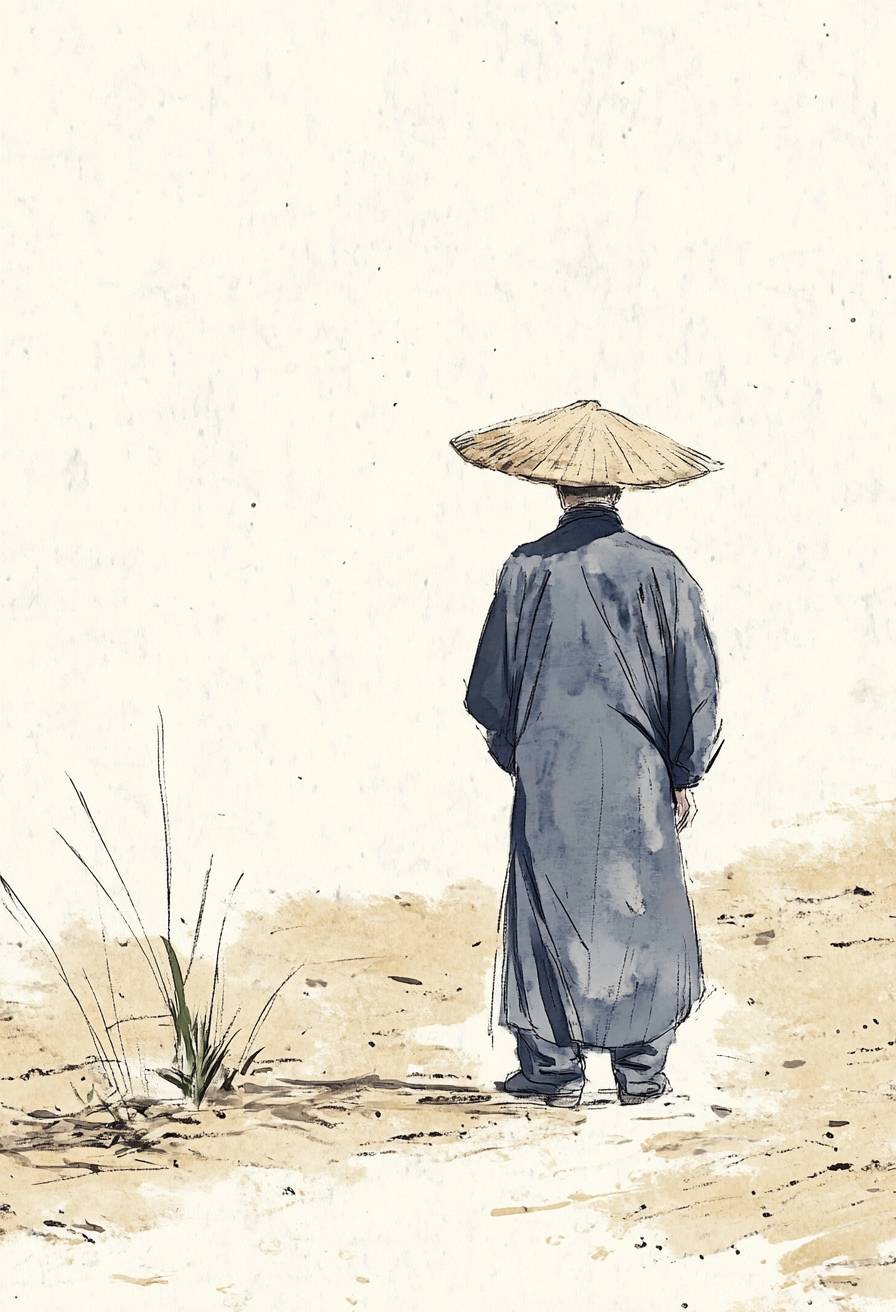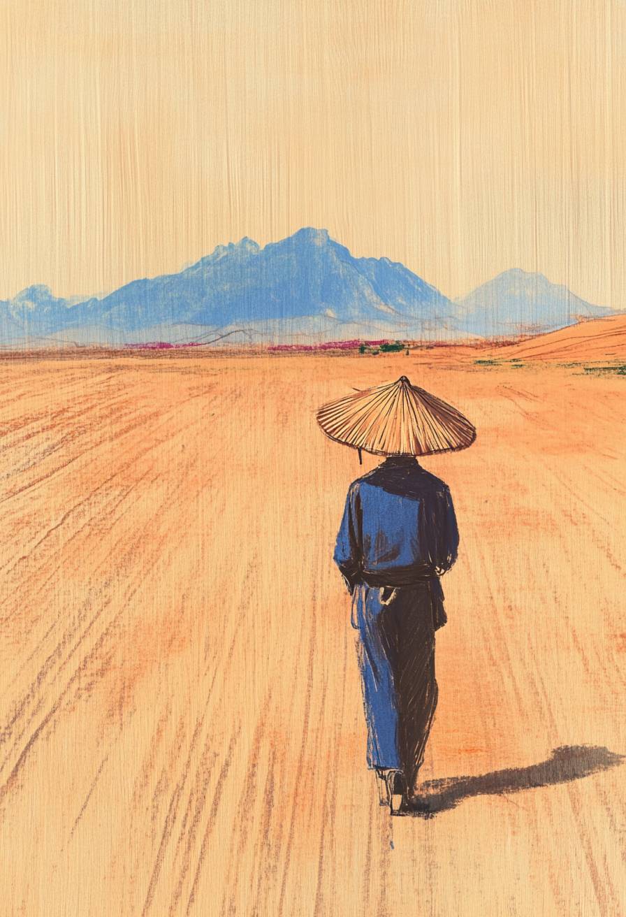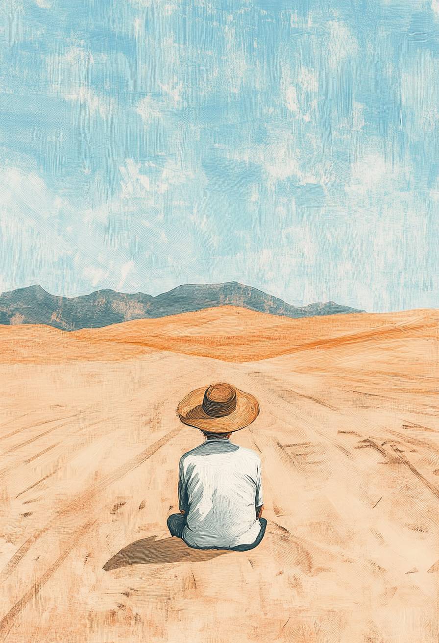 The back of a Chinese farmer in the desert, hand-painted stick figure, Crayon Drawing, Risograph Style, Pastel, 2D graphic superflat, Cartoon, --ar 87:128 --style raw --v 6.1