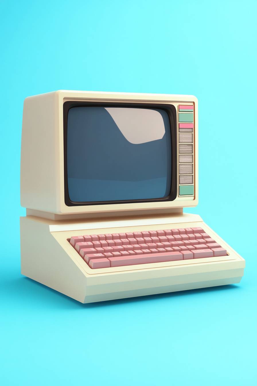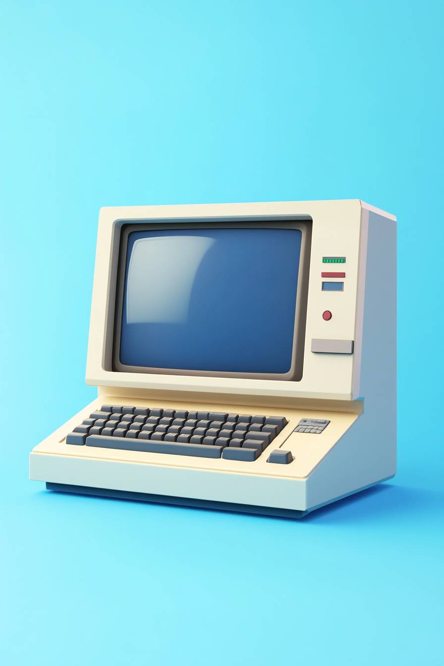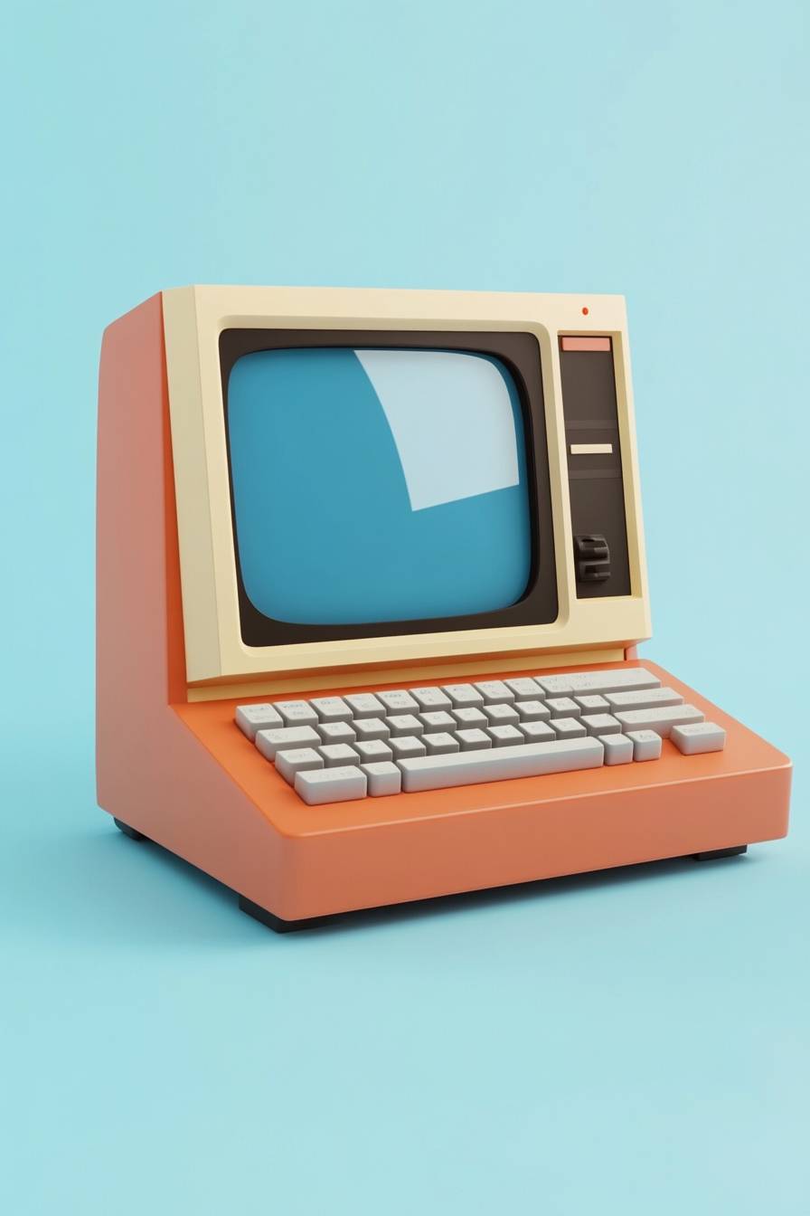 Um computador de estilo retrô com uma tela grande e teclado, renderizado em 3D, contra um fundo azul. O estilo lembra a primeira era dos computadores pessoais do meio do século XX.
