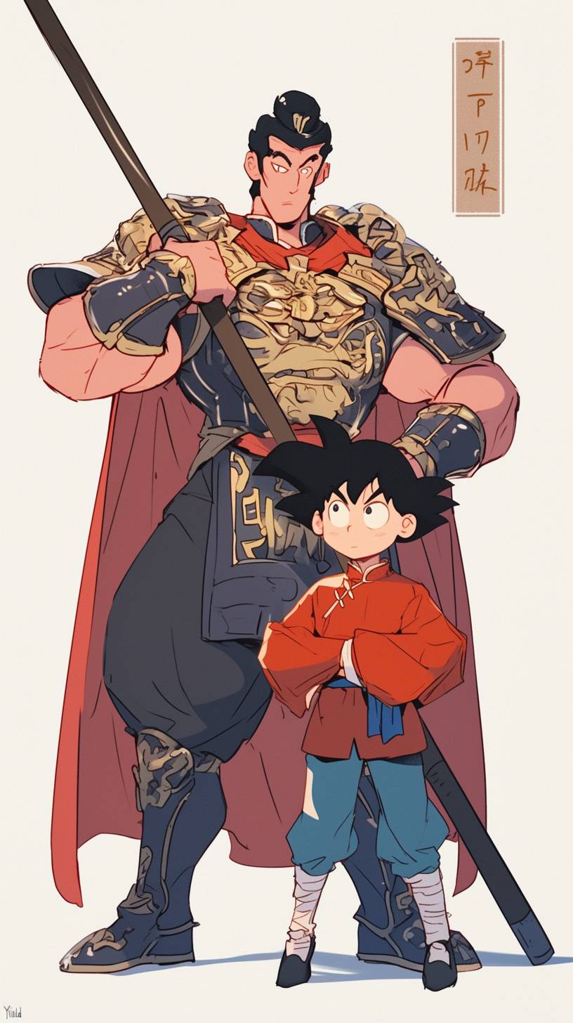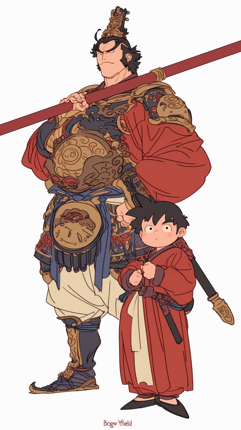 Um personagem de desenho animado no estilo de Crayon Shin-chan está em pé ao lado de Sun Wukong, vestido como um general chinês antigo, com a cabeça erguida e usando armadura em ambas as mãos segurando a arma 'Bogù Yfield'. Estilo de desenho animado, linhas simples, fundo branco. O Rei Macaco tem cabelo preto e usa Hanfu tradicional, enquanto atrás dele está o rosto do Rei Macaco parcialmente escondido pela sombra da luz de fogo de uma lâmpada de chama. Esta é uma versão fofa da primeira parte de Dragon Ball Z em uma tomada de corpo inteiro. Retrato em tamanho real. Animação 2D. Ângulo de 45 graus. Desenho em linha simples.