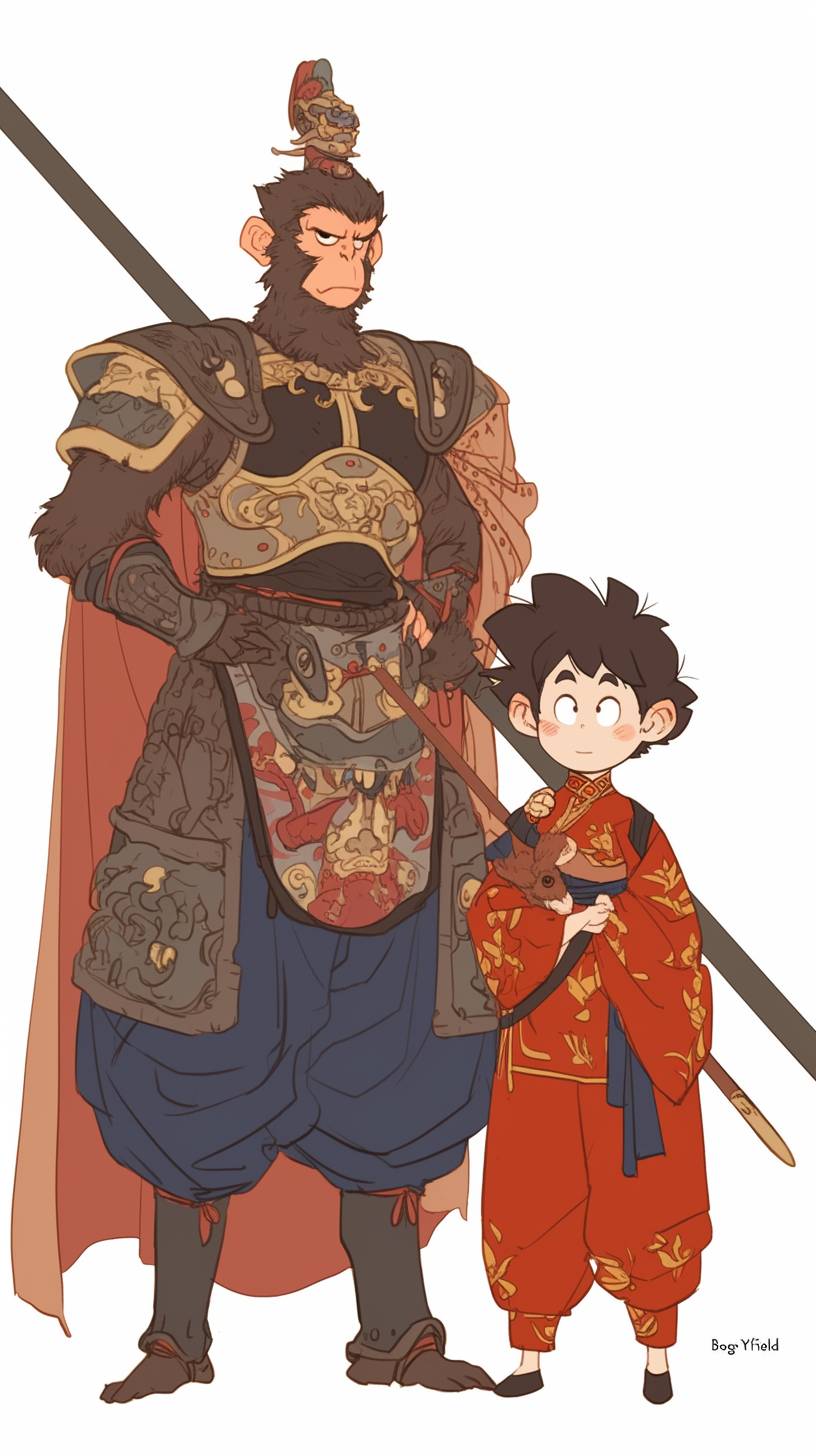 Ilustração de um personagem de desenho animado ao lado de Sun Wukong