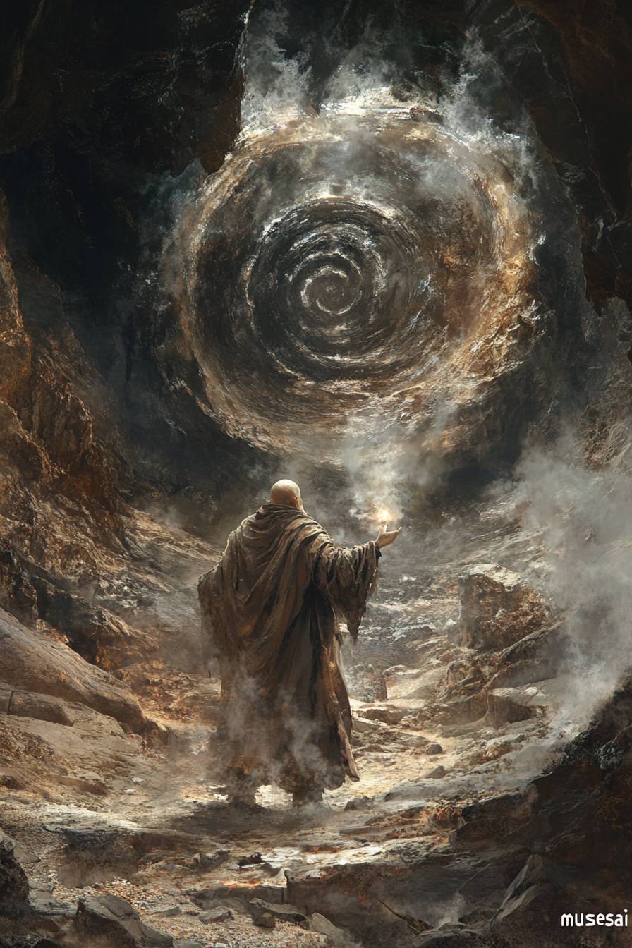 A mystical scene of a bulbous priest tapping into the Zynysphere, the magical energy beneath the earth's surface. Steam-like energy rises from the ground, forming a spiral. The rotund priest, wearing a robe and a headdress, stands on a rocky terrain. The background reveals a dark, cavernous structure. "musesai" --v 6.1 --ar 2:3