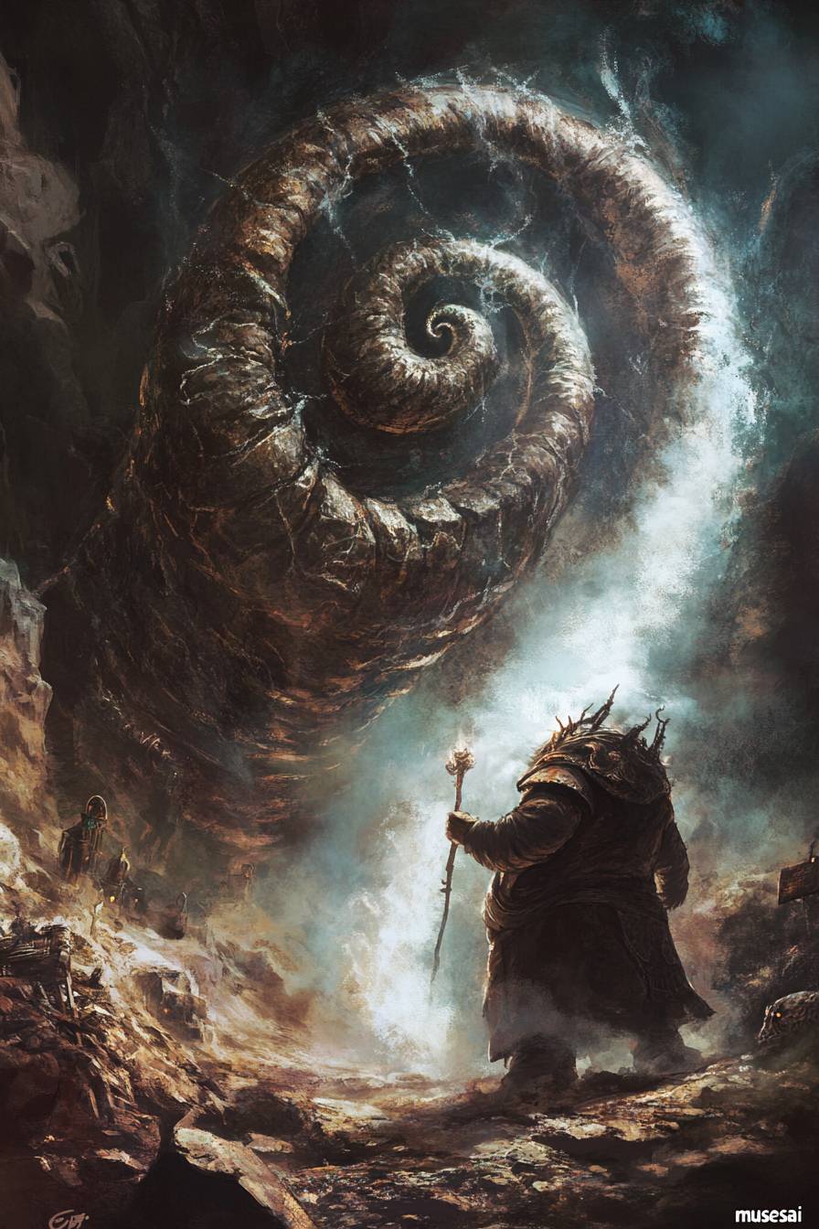 Uma cena mística de um sacerdote bulboso acessando a Zynysphere, a energia mágica sob a superfície da terra. A energia semelhante ao vapor se eleva do chão, formando um espiral. O sacerdote arredondado, vestindo uma túnica e um cocar, está em um terreno rochoso. O fundo revela uma estrutura cavernosa escura.