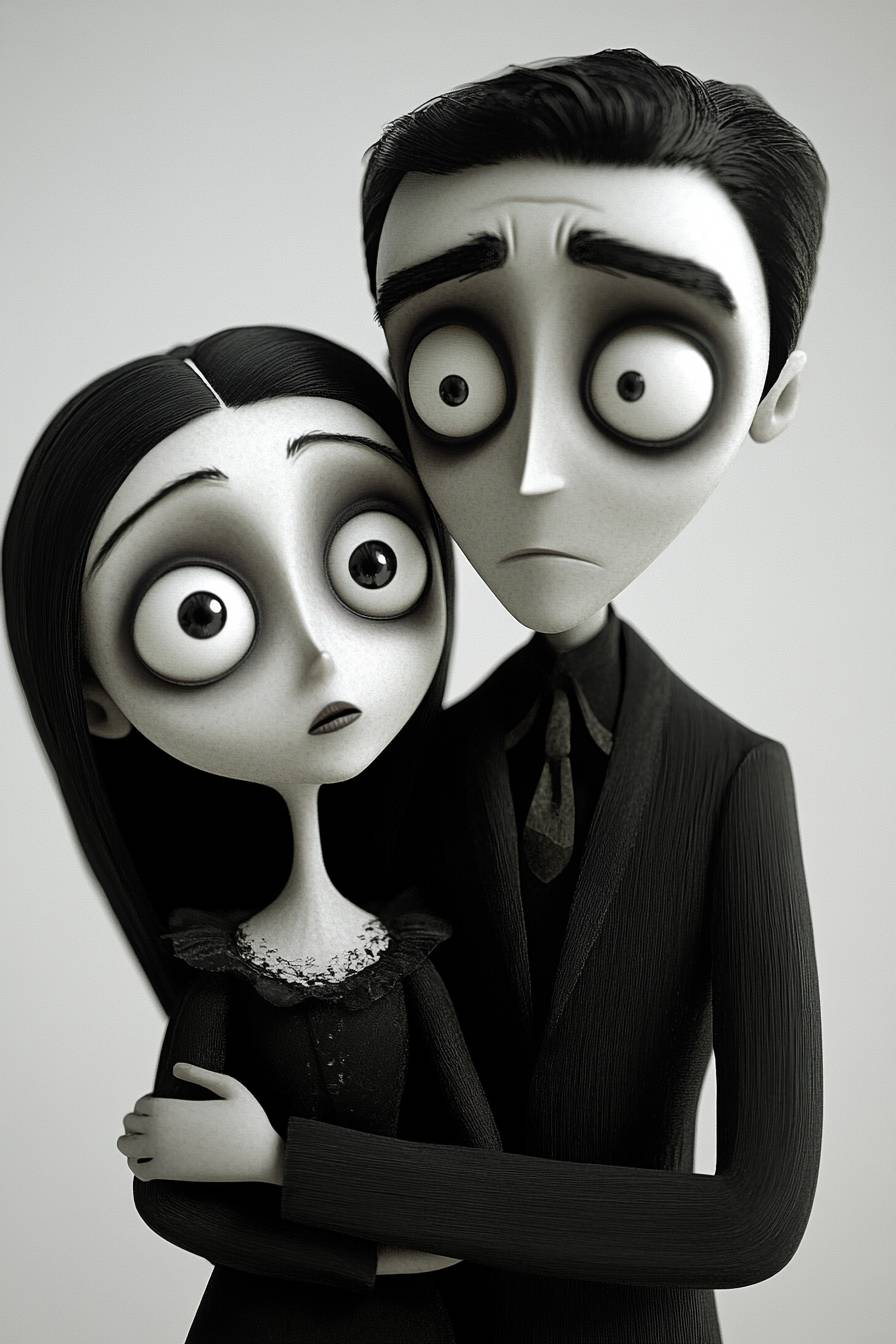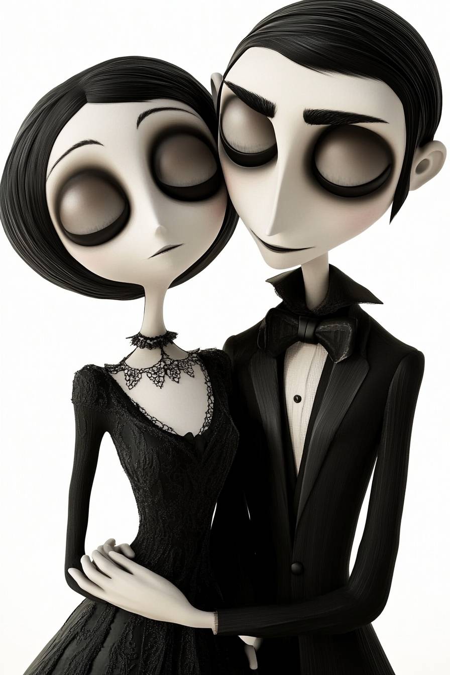 Uma animação em 3D de dois amantes góticos, no estilo da Pixar, com olhos grandes e um fundo branco simples, reconfortante.