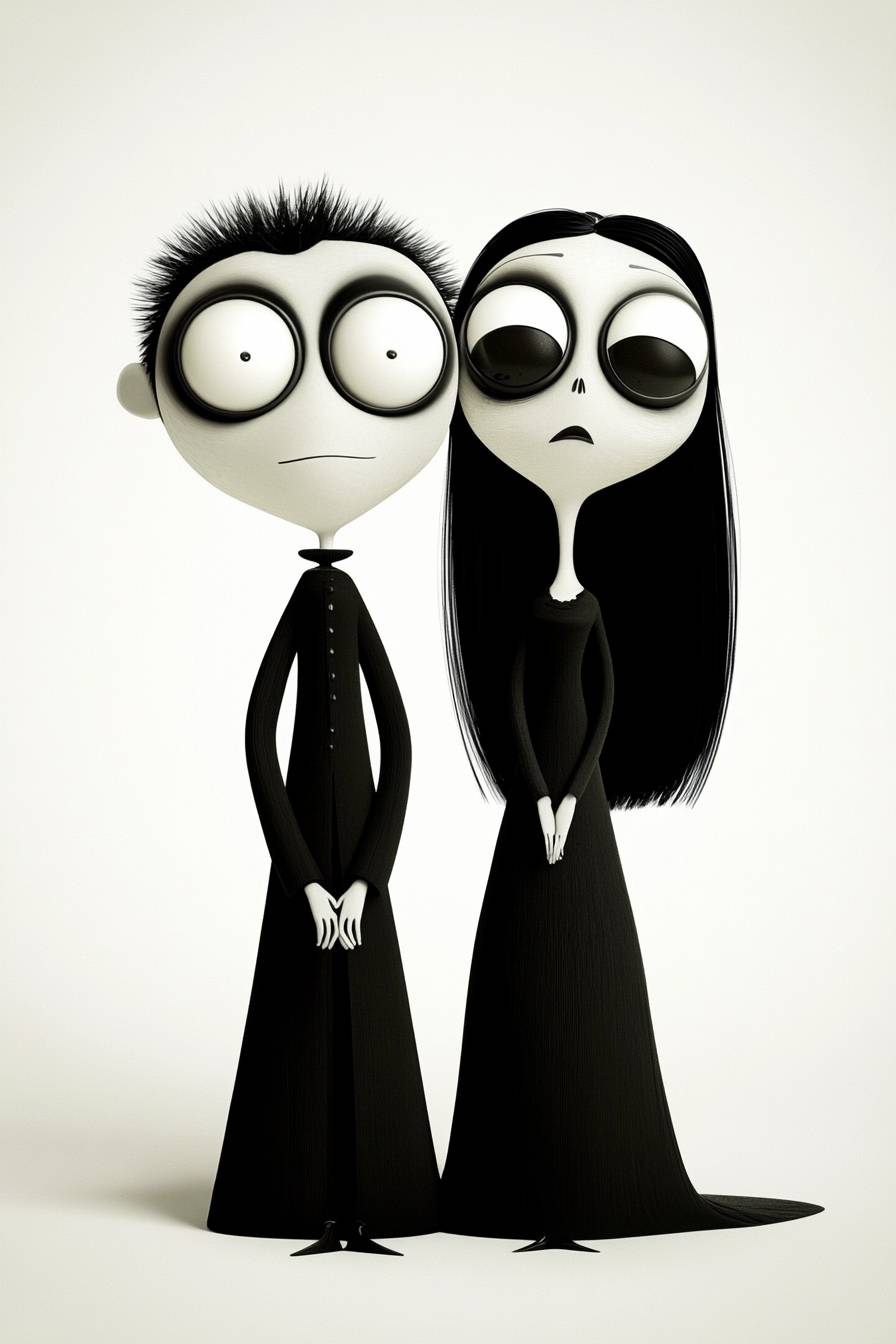 3D cartoon of two [SUBJECT] gothic lovers, in the style of Pixar, with large eyes and plain white background, heartwarming --ar 2:3