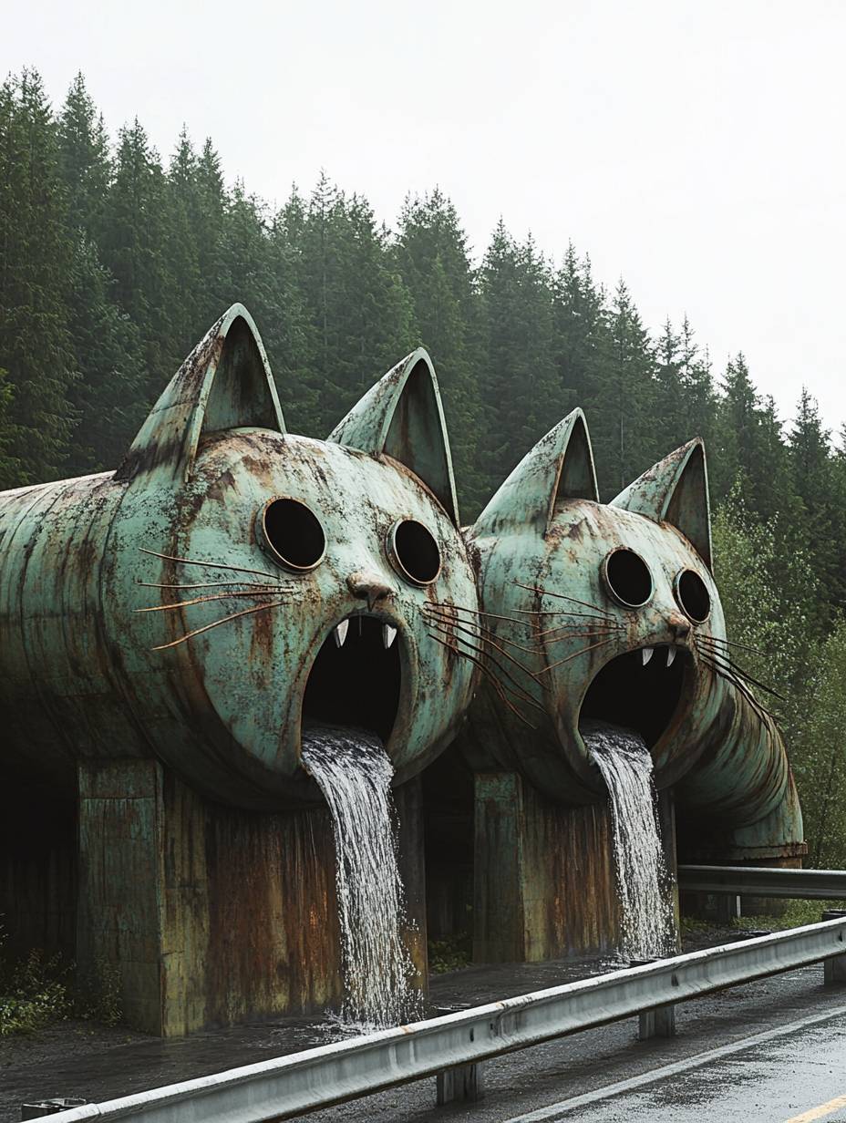 Uma foto de grandes tubos industriais que parecem gatos. Um tubo estava despejando água, fazendo parecer que um gato está doente. A cena inclui guardrails cinzentos de ambos os lados.