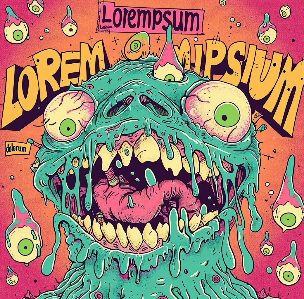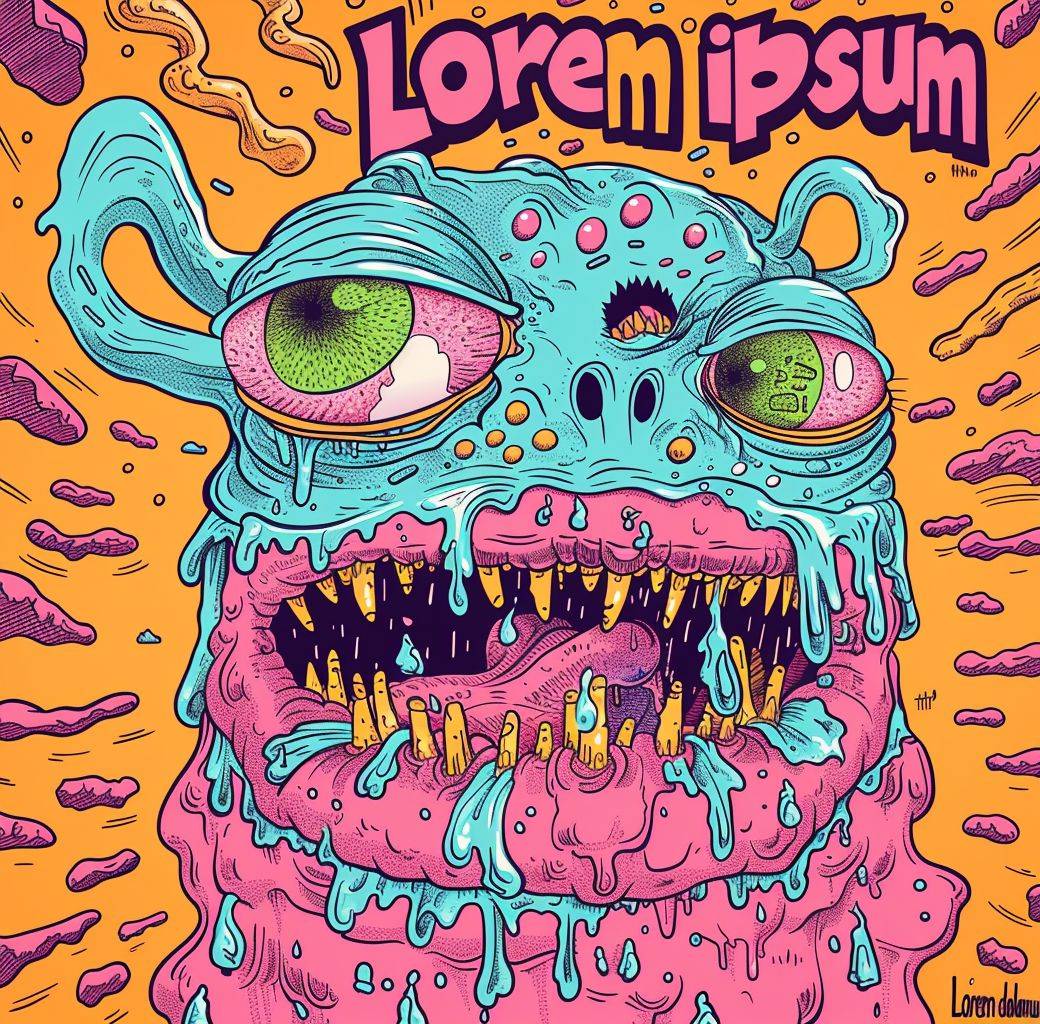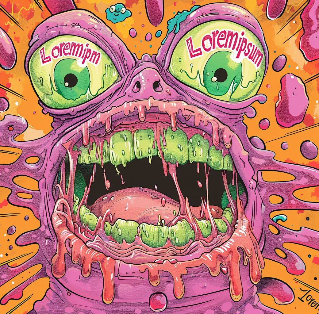 Uma ilustração em estilo de quadrinhos de Peter Bagge, retratando um monstro derretendo com três olhos e batom rosa, cercado pela frase 'Loremipsum', sobre um fundo vibrante rosa e laranja com pequenos padrões verdes, criando uma atmosfera divertida.