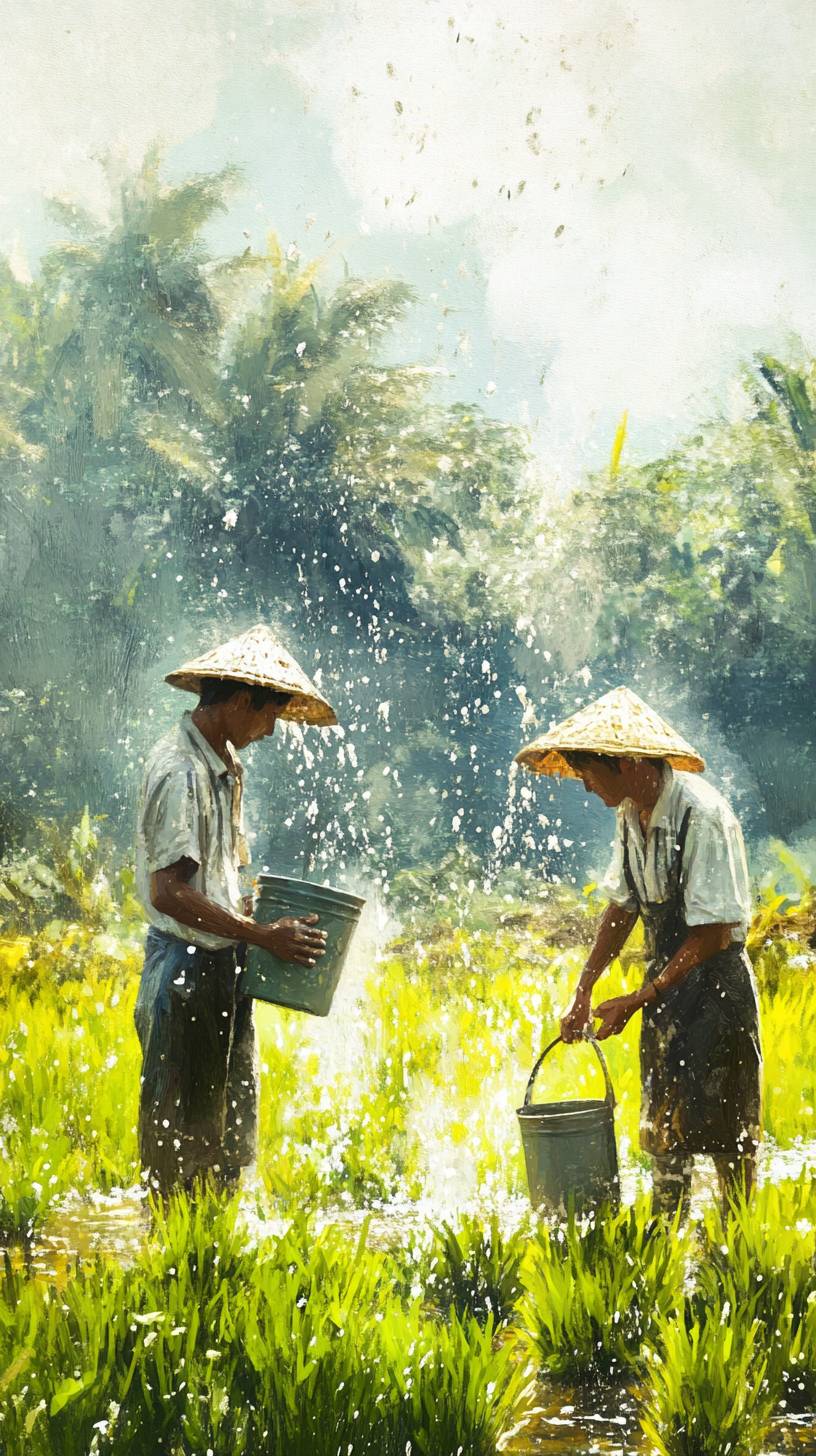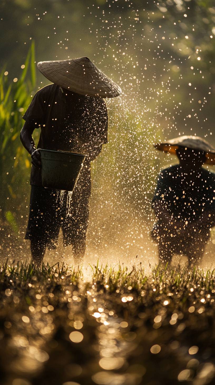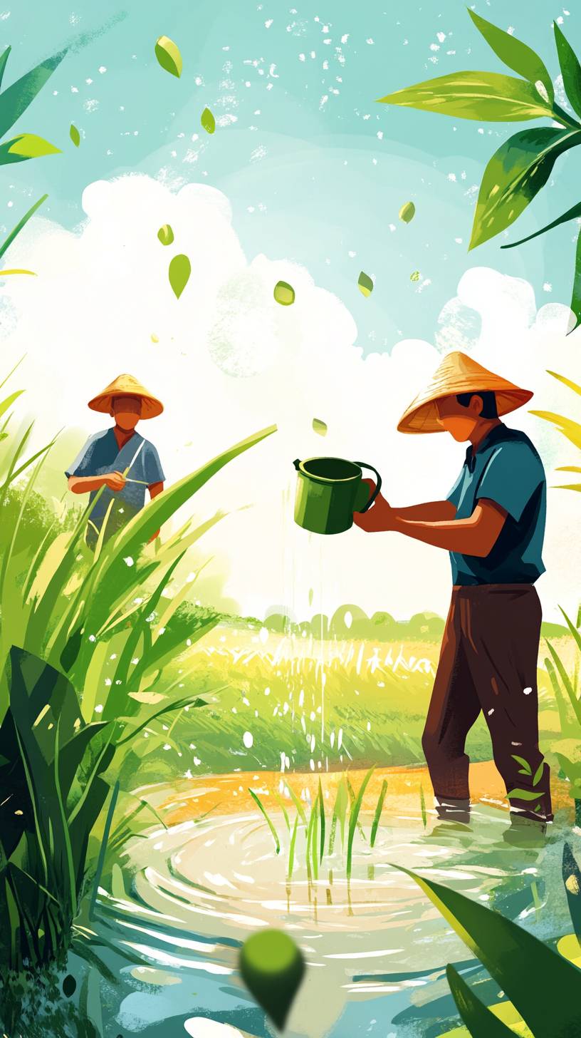 One farmer holding a bucket, catching water droplets falling from above, while another farmer is planting rice and irrigating the plants. --ar 9:16 --v 6.1