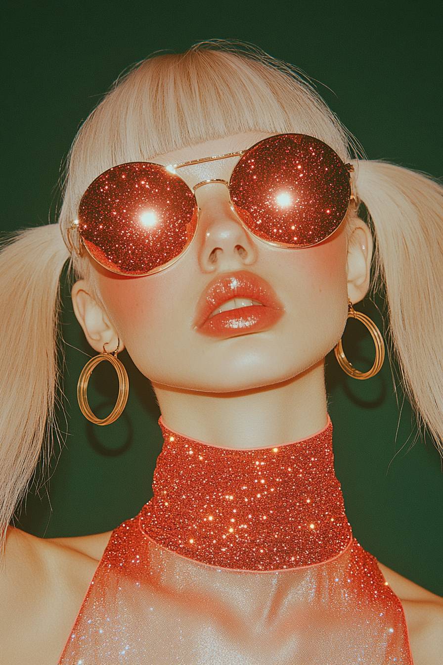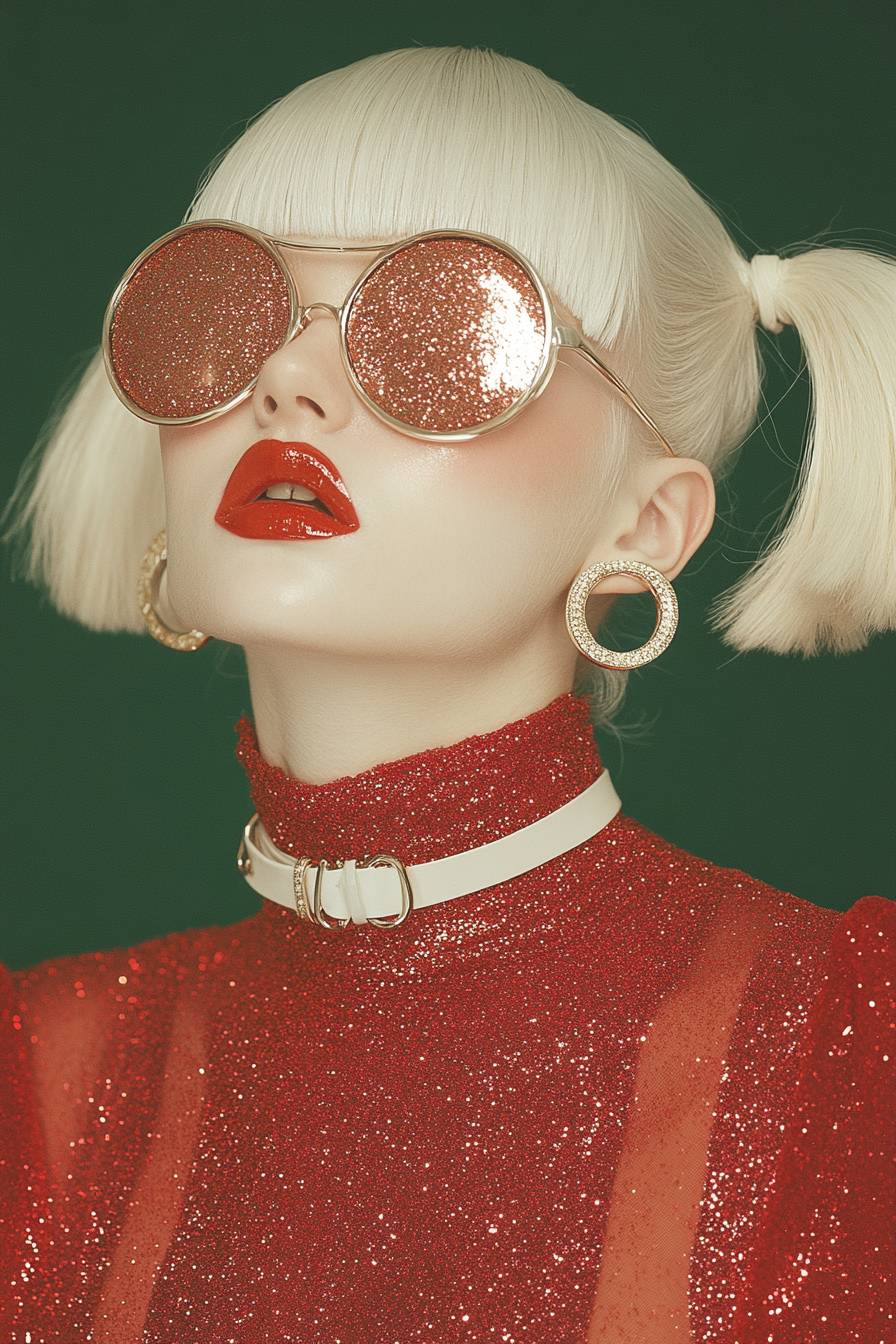 Um retrato em close-up de uma mulher excêntrica, de outro mundo e futurista com uma máscara de vidro metálico sobre os olhos. Ela tem pele branca e cabelo loiro preso em rabos de cavalo. Seu rosto está pintado com maquiagem de glitter vermelho, e ela usa brincos grandes redondos dourados e uma fina choker de rosa no pescoço. O fundo é verde escuro.