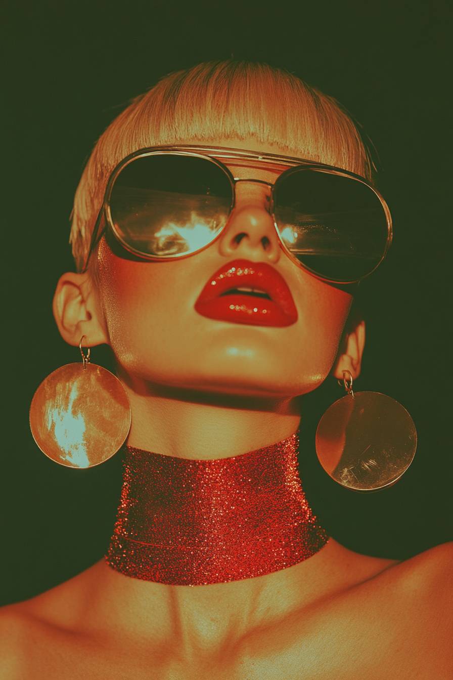 A close-up portrait of an eccentric, otherworldly and futuristic woman with a metallic glass mask over her eyes. She has white skin and blonde hair tied into pigtails. Her face is painted in red glitter makeup and she wears oversized round gold earrings and a thin rose-colored choker necklace around her neck. The background is dark green. --ar 85:128 --personalize sewed4w --stylize 700 --v 6.1