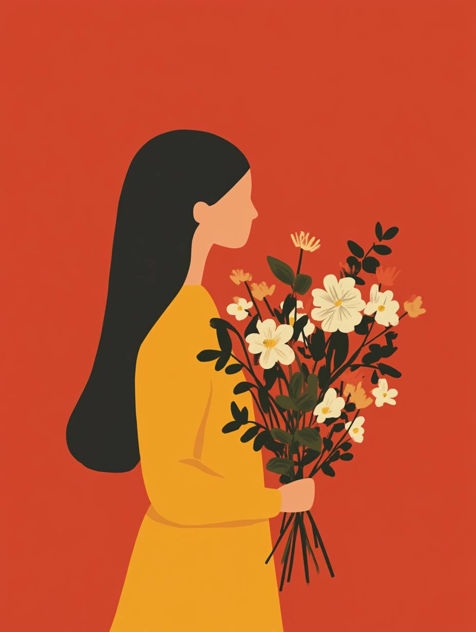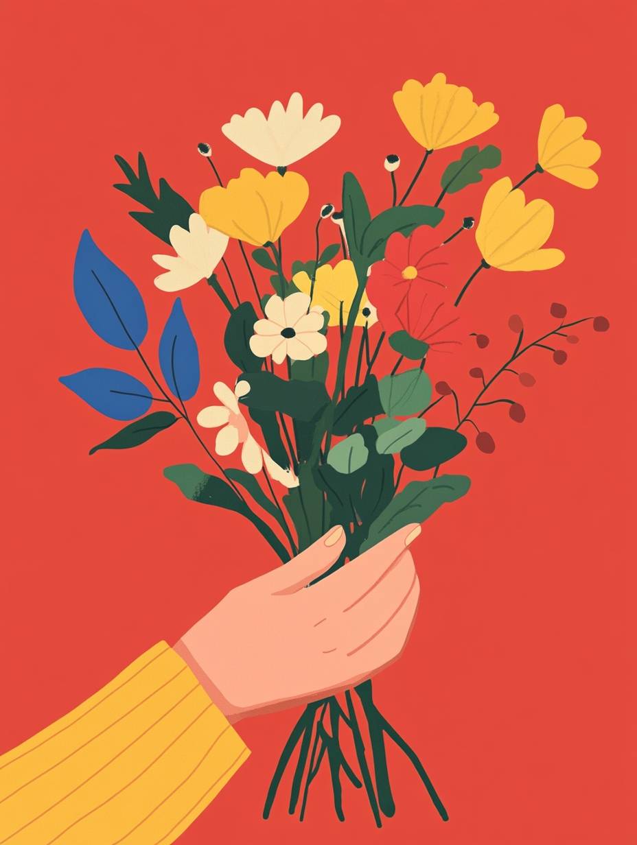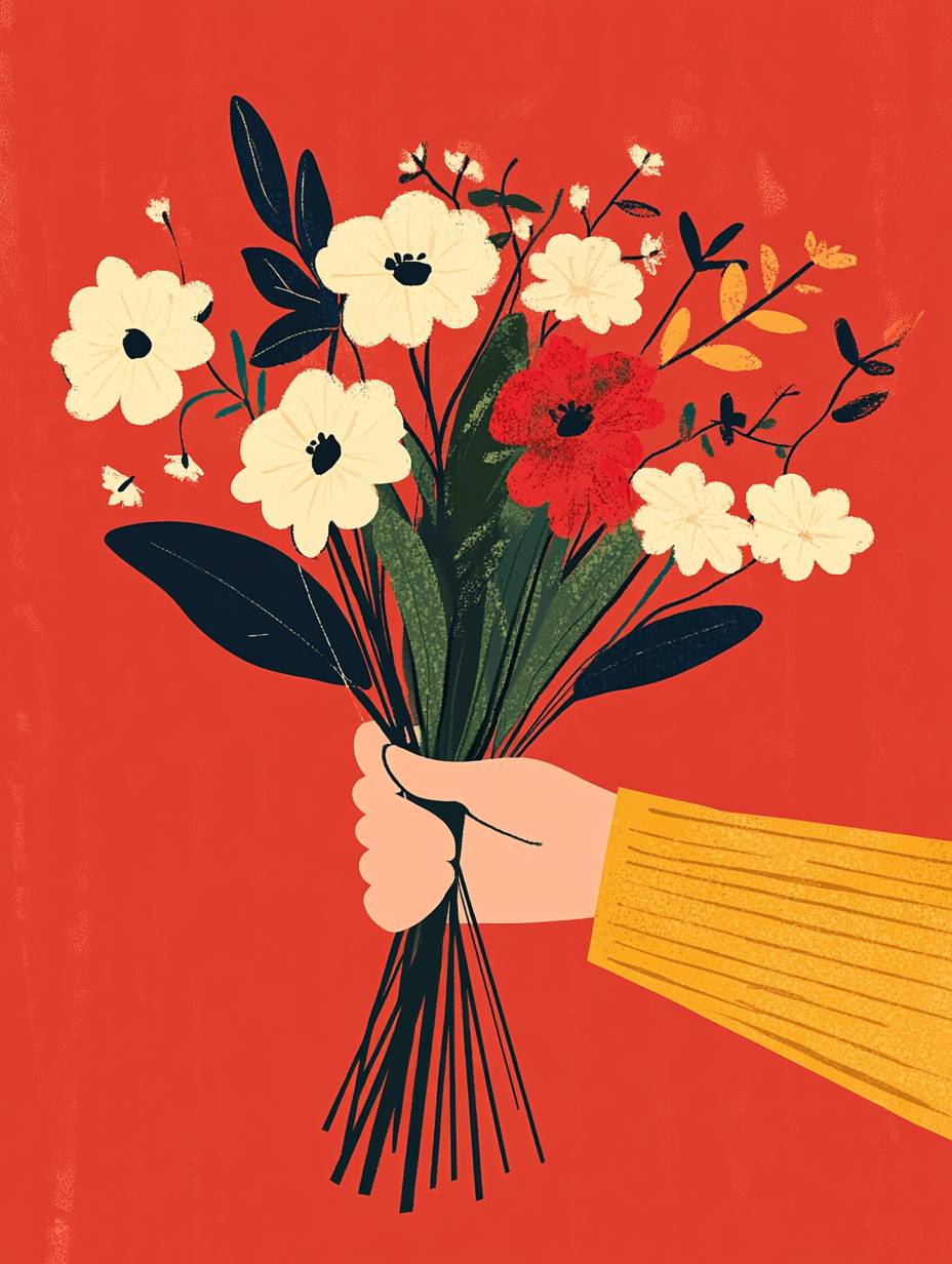 A teacher holding a bunch of flowers,Teacher's Day,Memphis,flat illustrations,close-up,minimalism,red background,warm --ar 3:4 --v 6.1