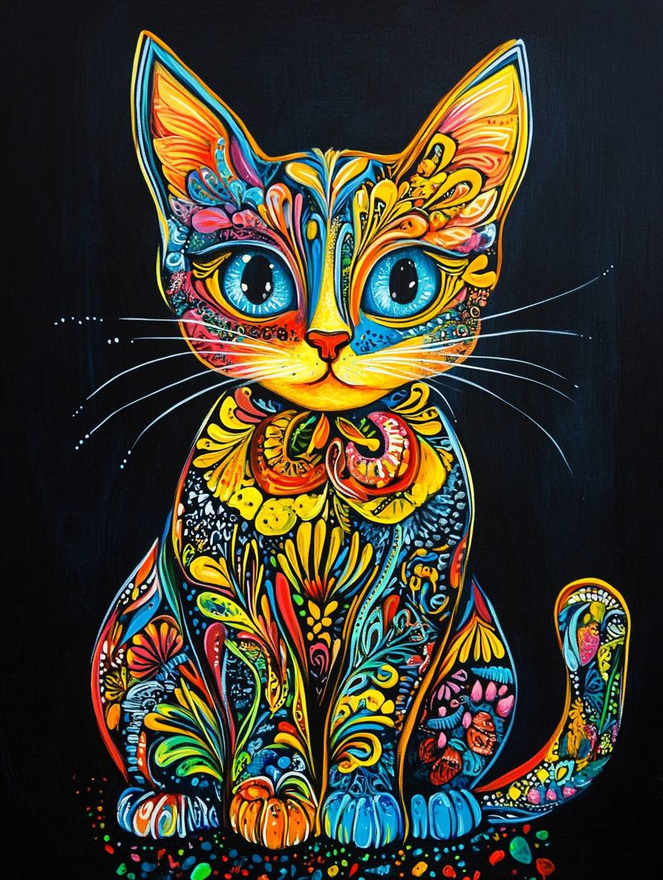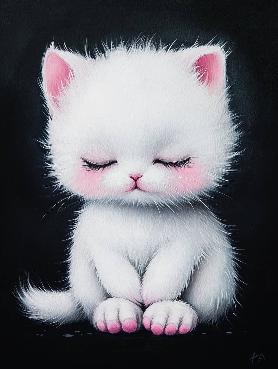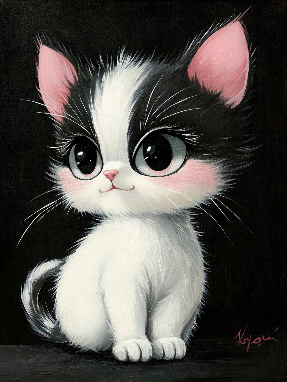 Gatinho Kawaii pintado à mão em fundo preto