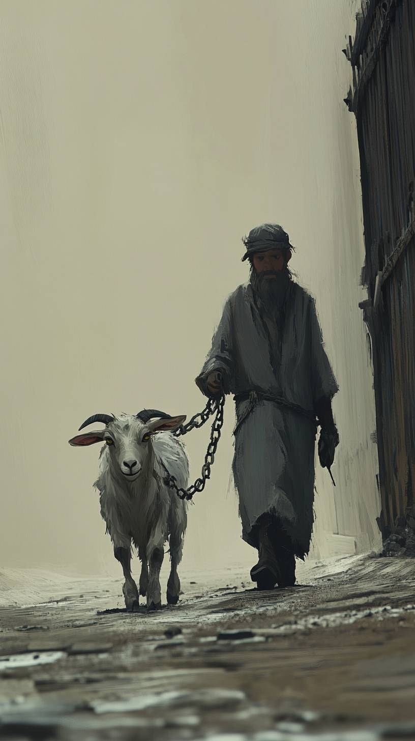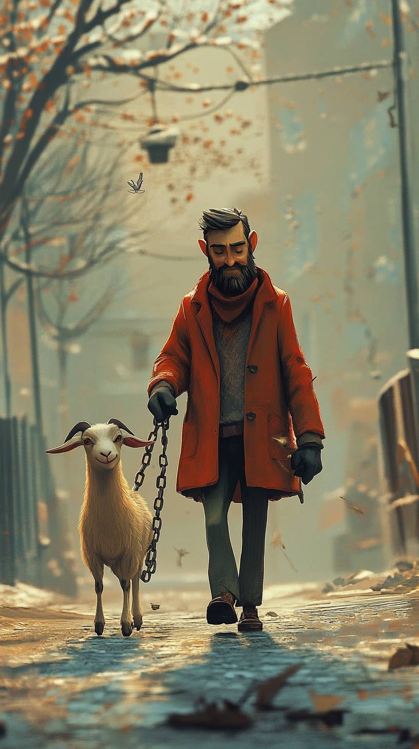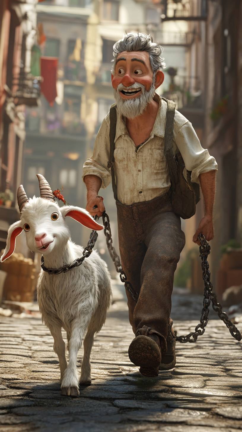 Um homem caminhando com uma cabra encadeada, estilo Pixar, engraçado