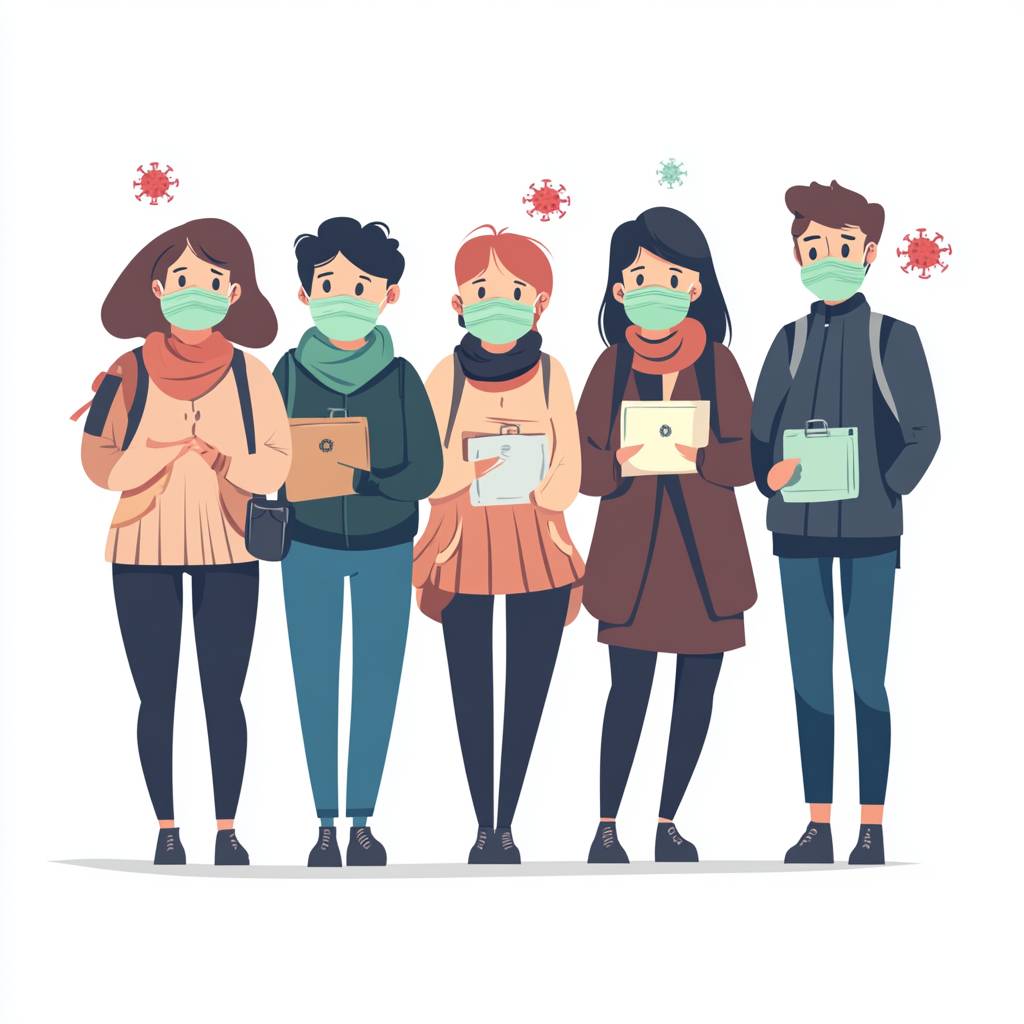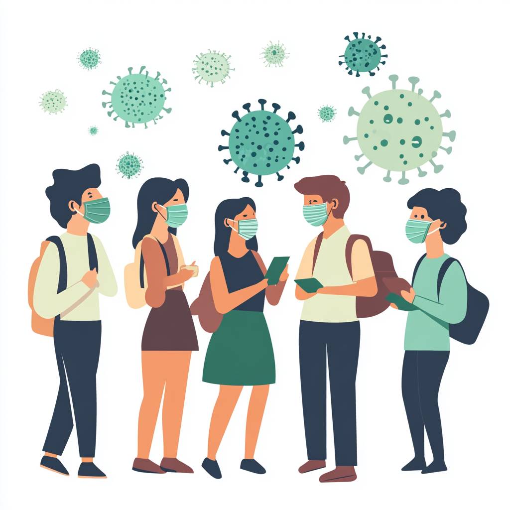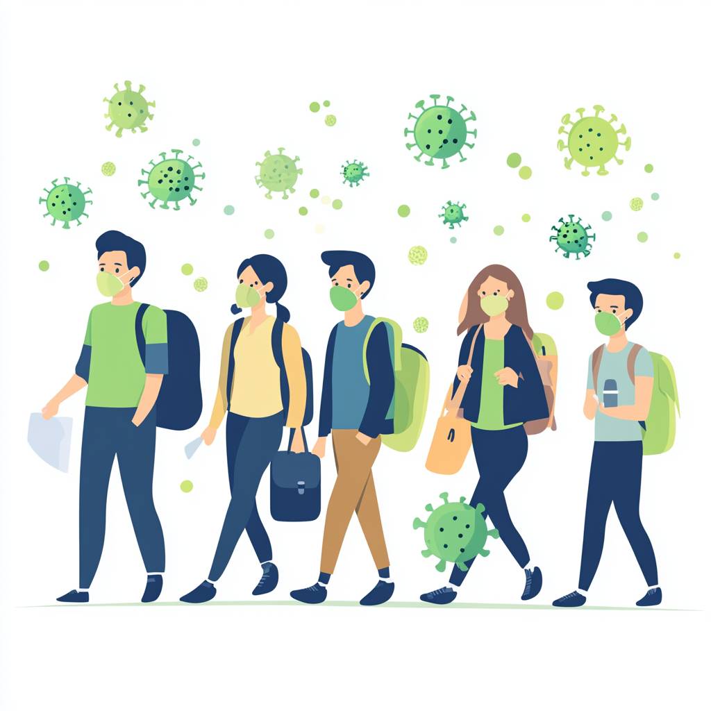 Arte vetorial representando surtos de doenças infecciosas, com seis pessoas usando máscaras e um grupo de pessoas usando máscaras e mantendo uma certa distância, tema claro, paleta de cores: #008c6d (ou seja, verde claro). Crucial: fundo branco.