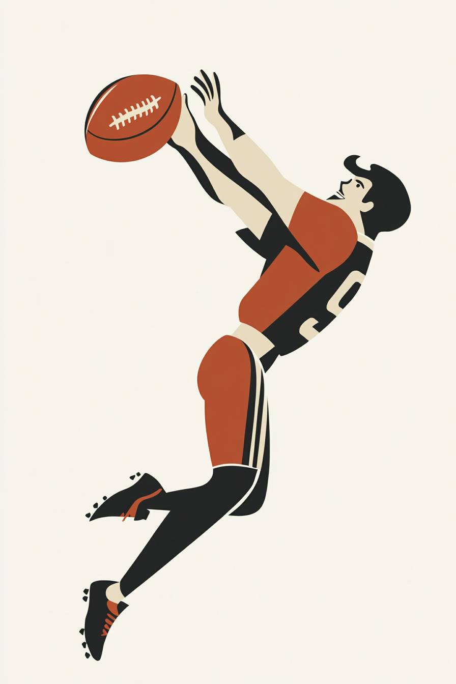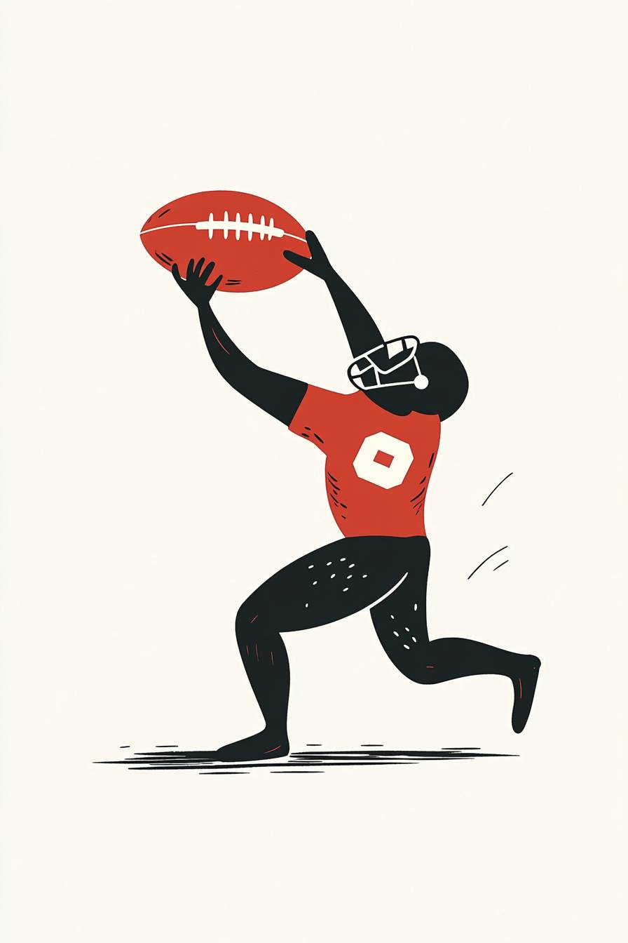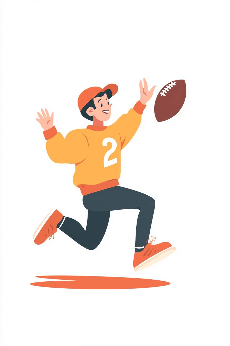 A cartoon person playing American football on a flat white background, flat design illustration, simple shapes, simple lines, low details, flat vector graphics style, minimalism, 2D, flat illustration, white background, simple, no shadows, only one character is visible, cartoon character, disproportionate, dramatic, exaggerated form, midcentury modern inspiration --ar 2:3 --v 6.1
