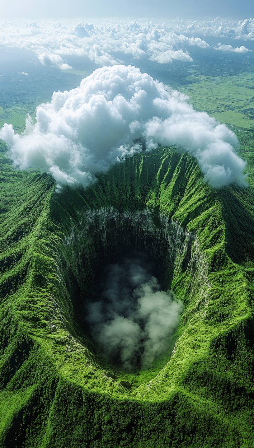 A giant white mushroom cloud in the shape of an umbrella floats above a large pit in the center of a green hill. You can clearly see the shape of the umbrella handle and surface. It is a realistic National Geographic photography style, high-resolution digital photography, and surreal. --ar 61:108 --stylize 1000 --v 6.1