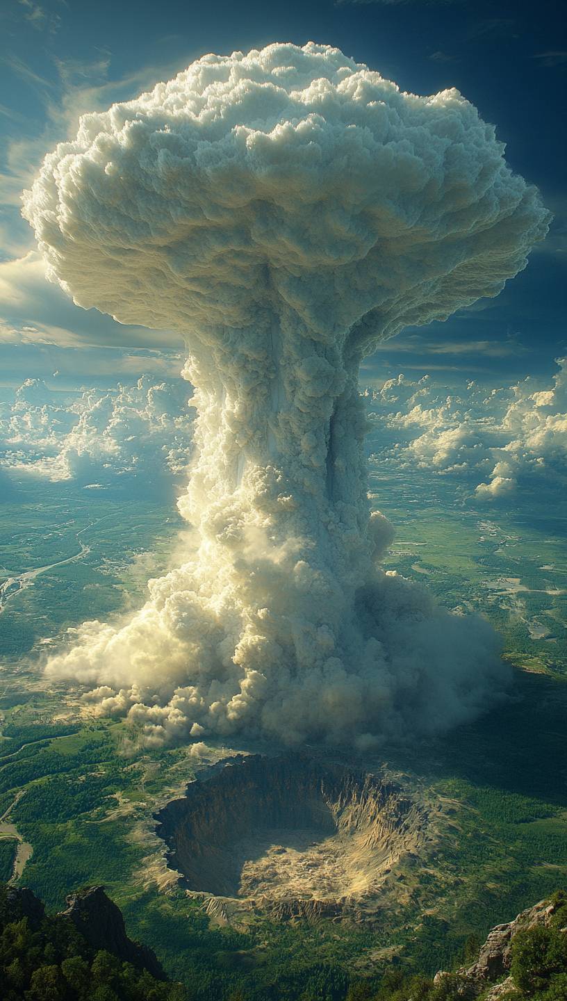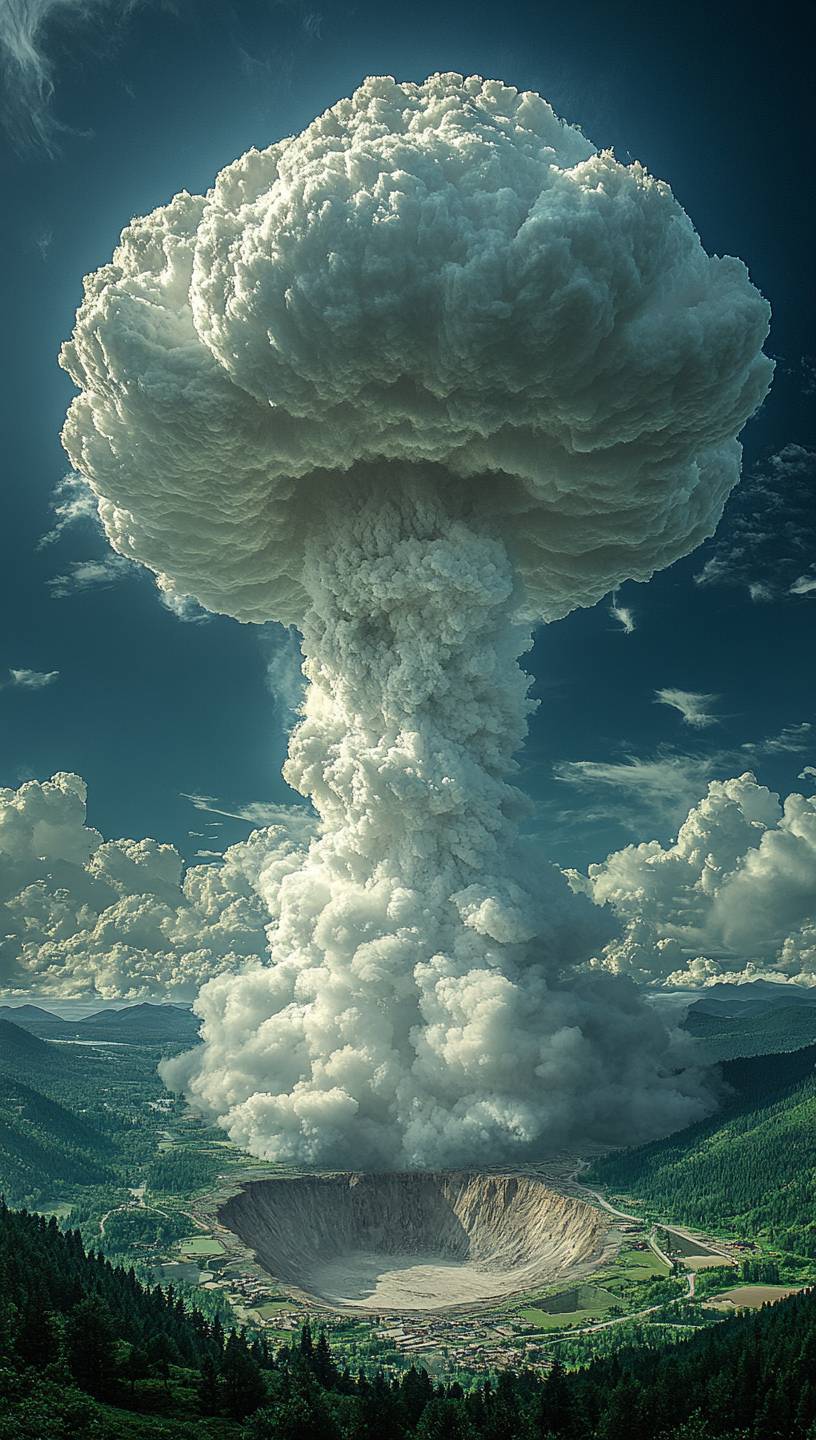 Uma enorme nuvem de cogumelo branca em forma de guarda-chuva flutua acima de uma grande cratera no centro de uma colina verde. Você pode ver claramente a forma do cabo e da superfície do guarda-chuva. É um estilo fotográfico realista da National Geographic, fotografia digital de alta resolução e surreal.
