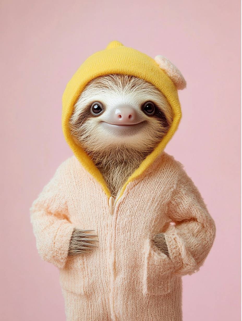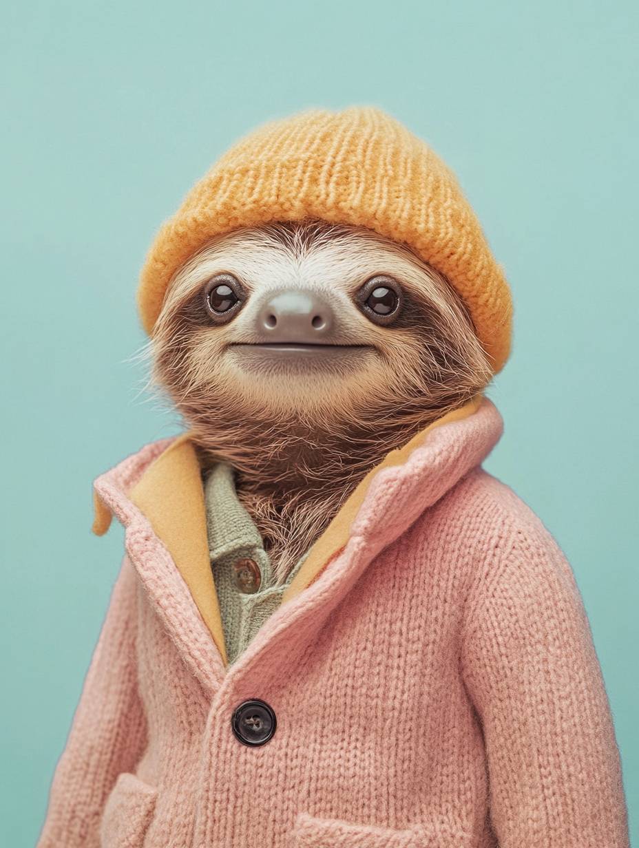 Um bicho-preguiça bebê antropomórfico sorridente vestido como um todler, cores pastel, estilo Wes Anderson