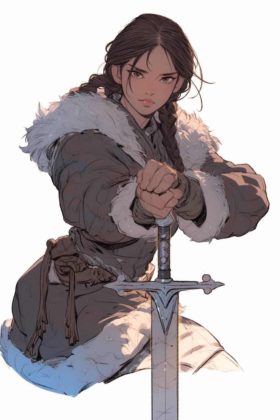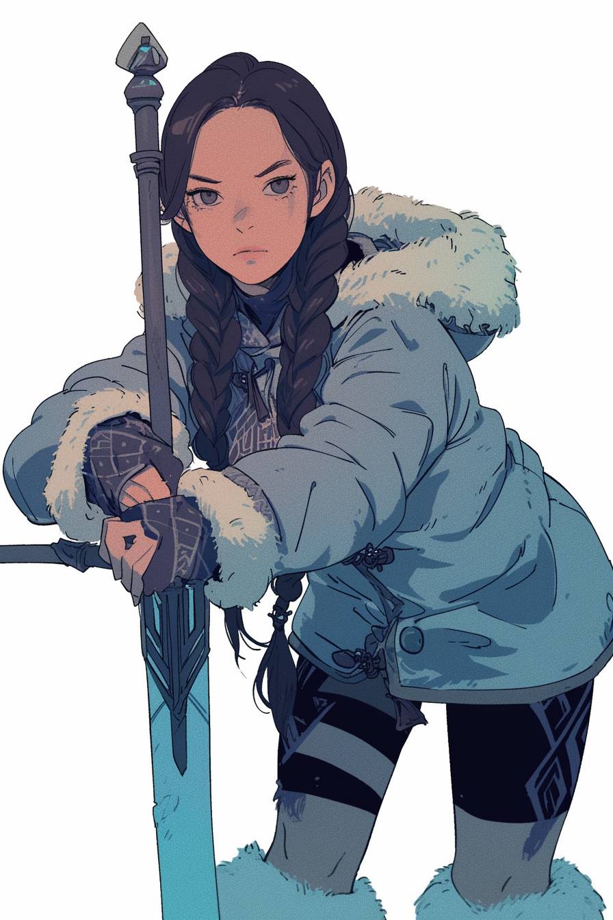 Eskimo woman with two thin black pigtails in a jacket with a fur trim leans on a two-handed sword, white background, drawn in Disney style, stern face --ar 2:3 --niji 6