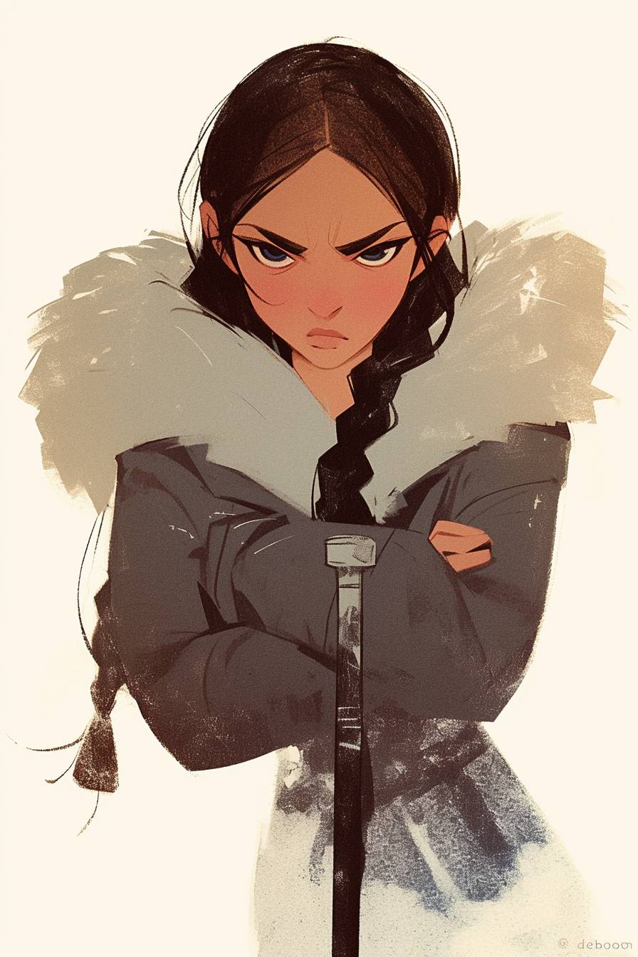 Uma mulher esquimó com duas tranças finas e pretas em uma jaqueta com acabamento de pele se apoia em uma espada de duas mãos, fundo branco, desenhada no estilo da Disney, com um rosto sério.
