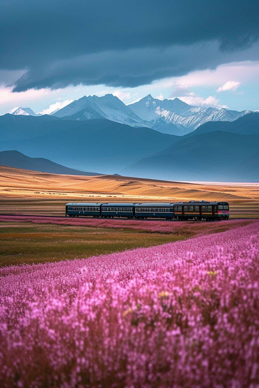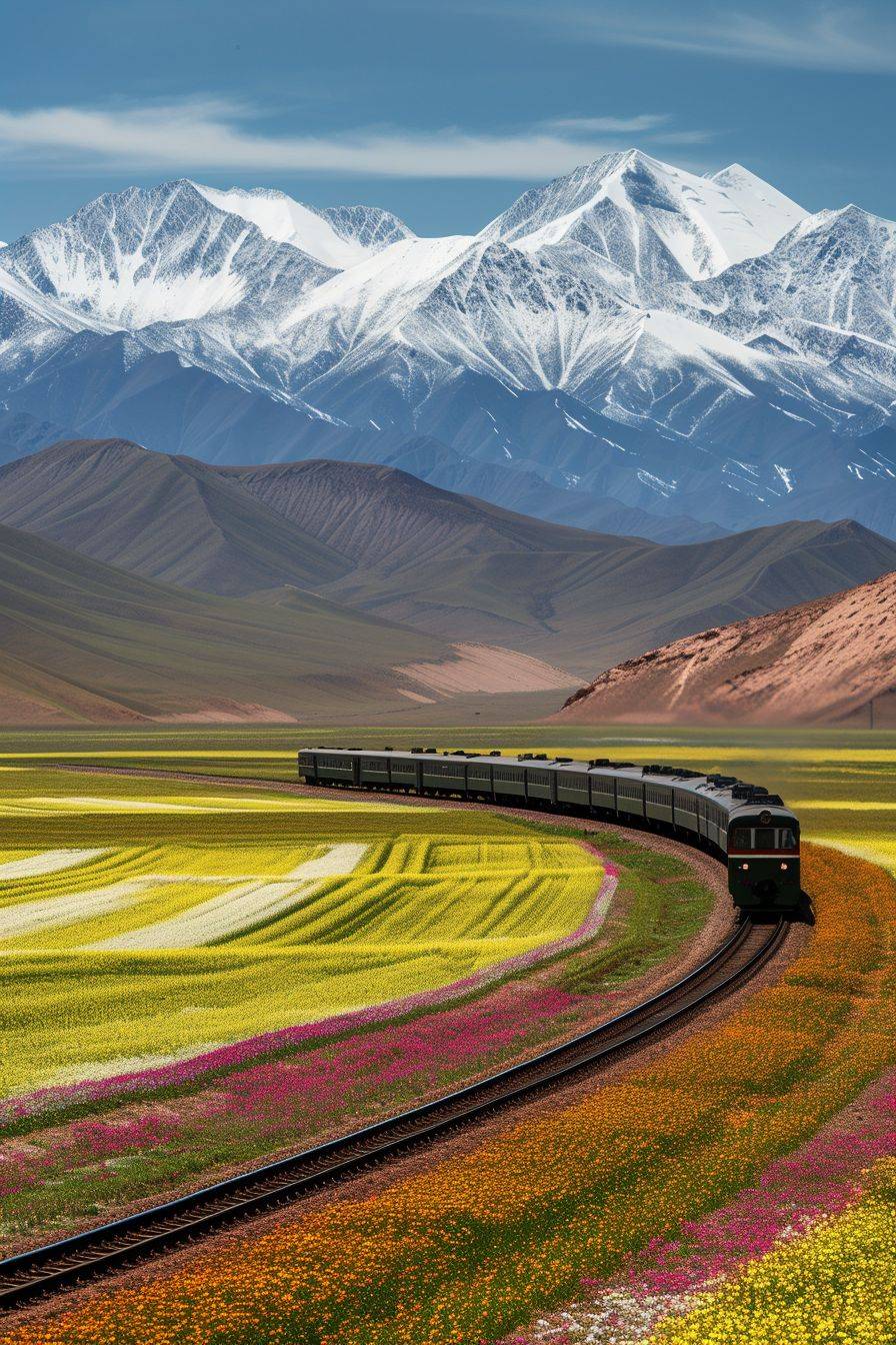 The Qinghai Tibet Railway , a chinese train traveling on the Qinghai Tibet Plateau, with beautiful snow capped mountains in the distance,In spring, flowers bloom in the fields, creating a fresh and romantic feeling,low angle perspective,the highest image quality,award for photography --ar 2:3 --v 6