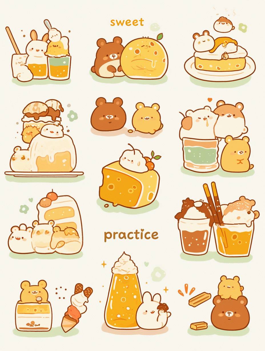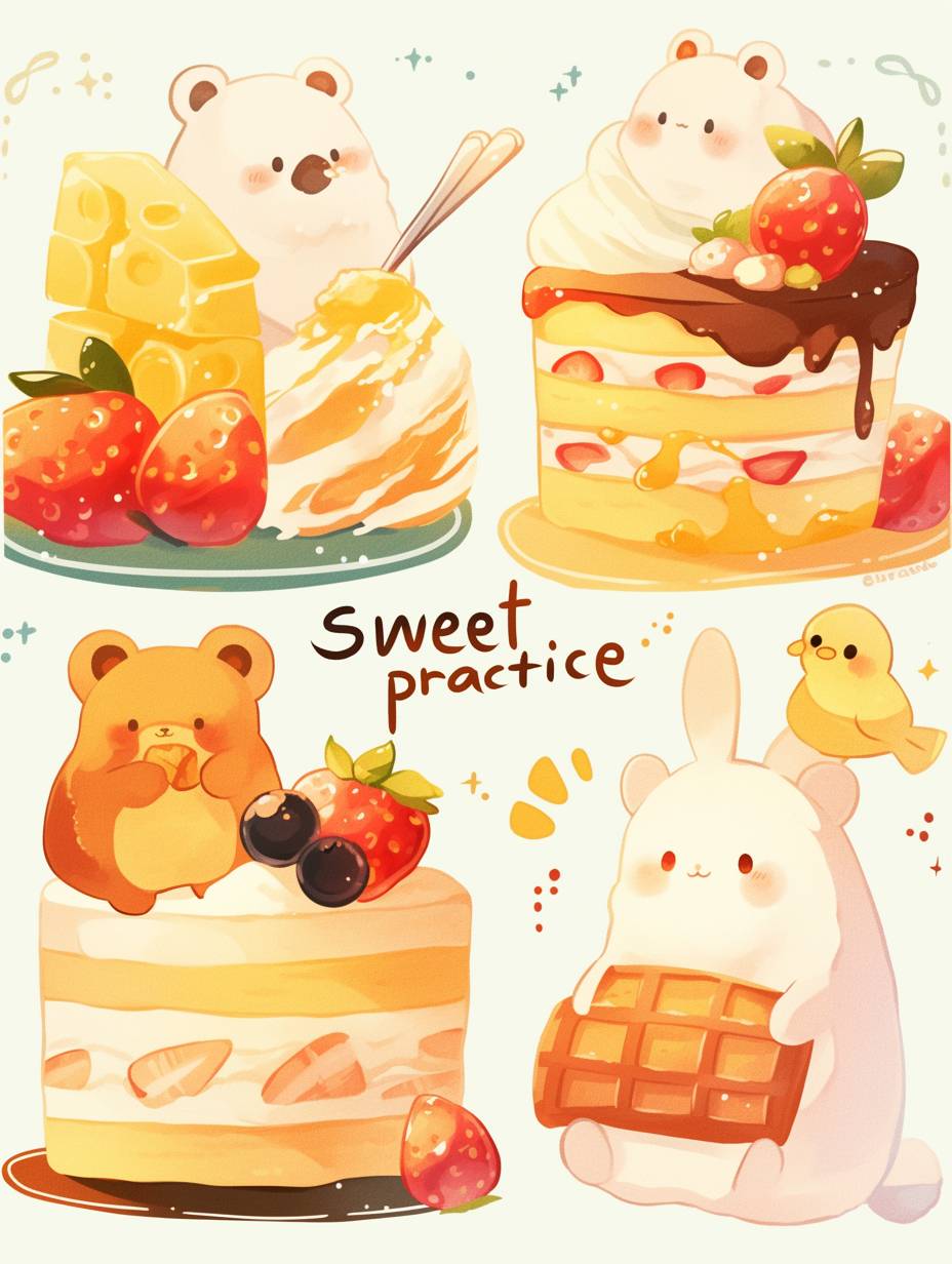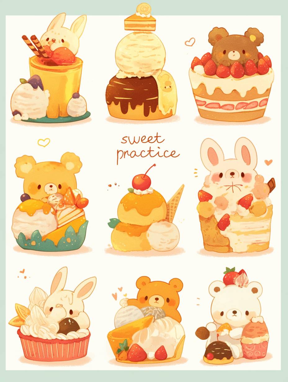 A set of simple line drawing illustrations, featuring ice cream cakes and cute animals as the theme. The background color is white with green borders on all four sides. Each illustration includes three elements, such as a cake, a vanilla-colored melting brown bear, or a rabbit holding an extremely large yellow cheese ball, with a short text "sweet practice" below it in a Japanese-style font. The illustrations are in the style of minimalist style, flat design, simple shapes and lines, and no shading. --ar 3:4 --stylize 116 --niji 6