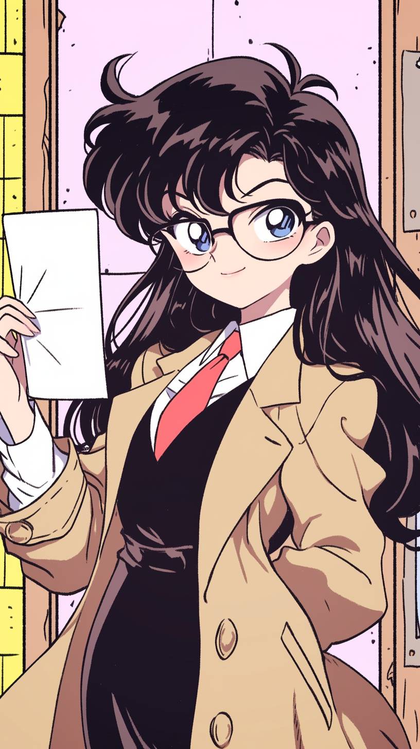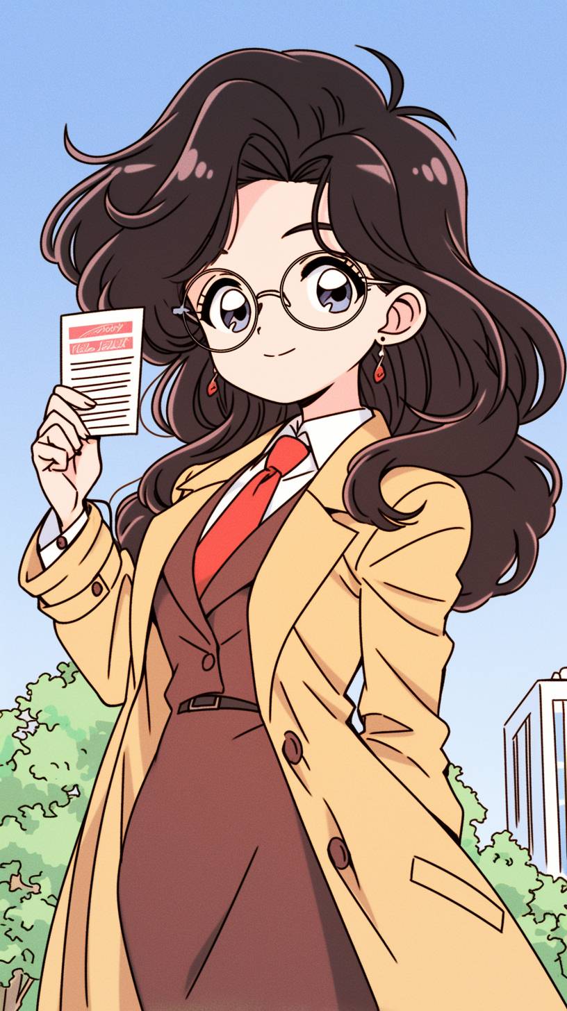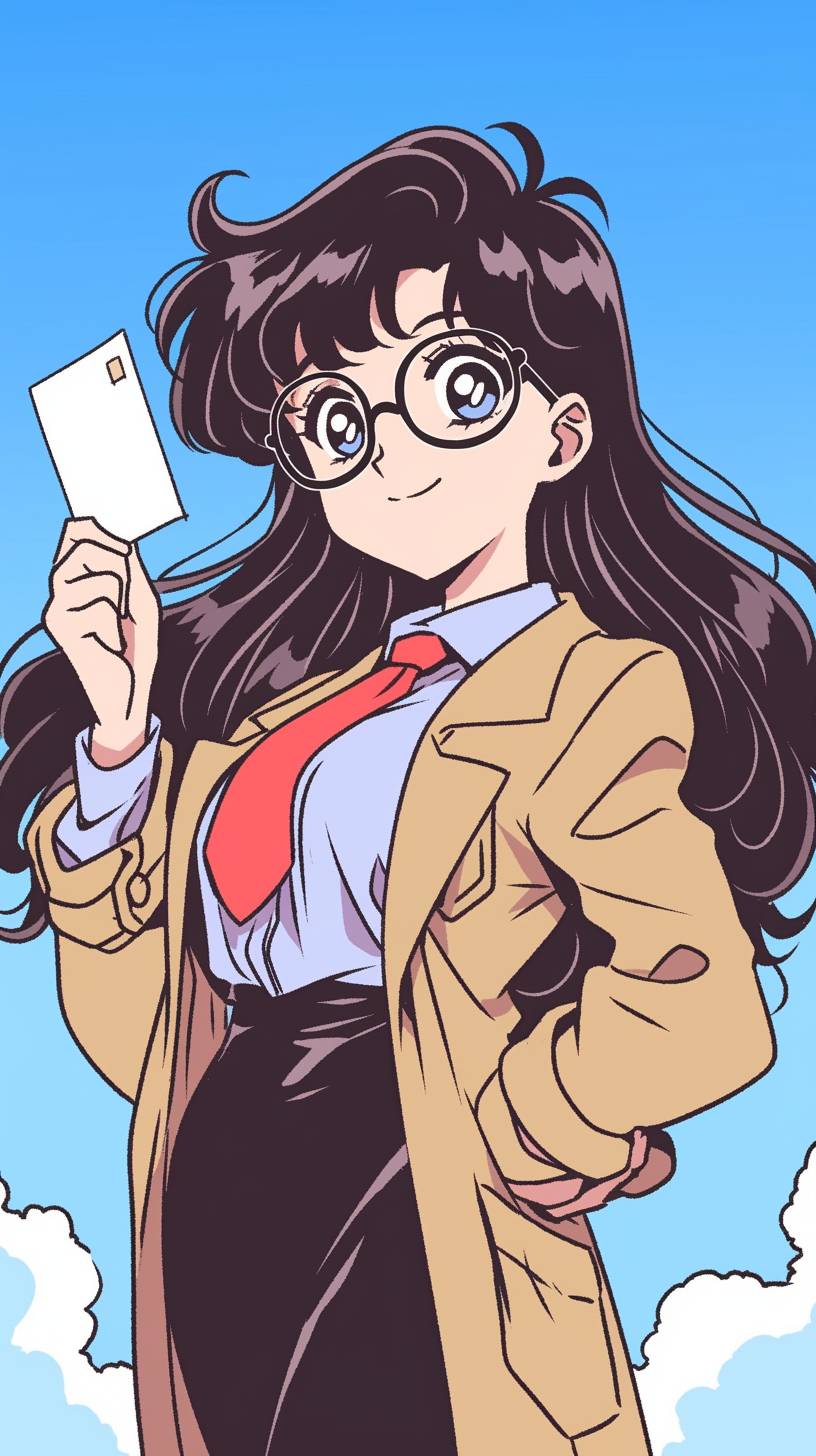 extra scenic shot of anime teaser visual, face,Yomiko Readman with glasses and long black hair holding up her business card, brown vest over shirt, school teacher, 1girl in brown coat, looking at viewer, smile, bangs, blue eyes, black pencil skirt and shirt, long sleeves, holding blank white paper cards, closed mouth, white shirt with open clothes, collared shirt, vest, coat, red necktie, black-framed glasses, open coat, brown vest --ar 9:16 --sref 2840755324 --niji 6