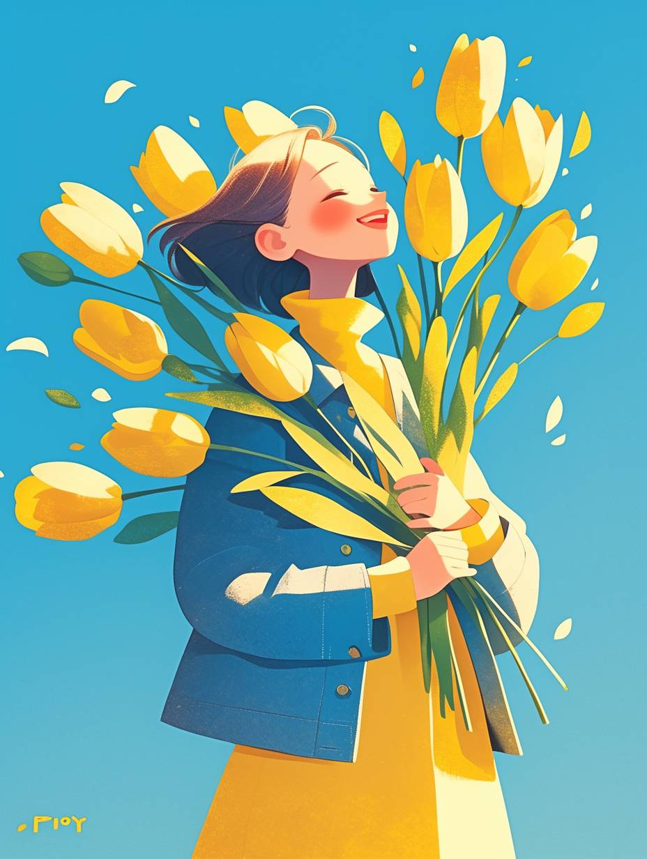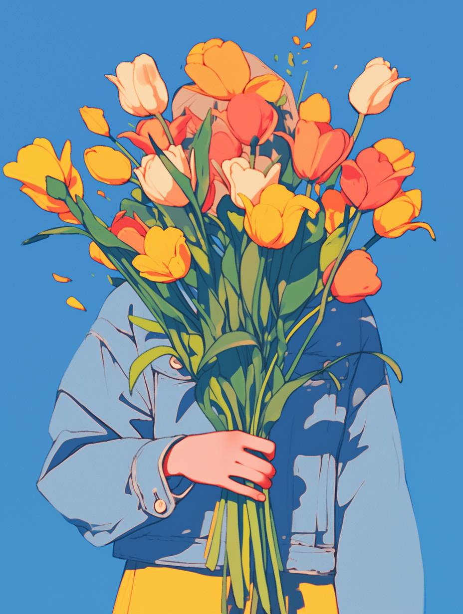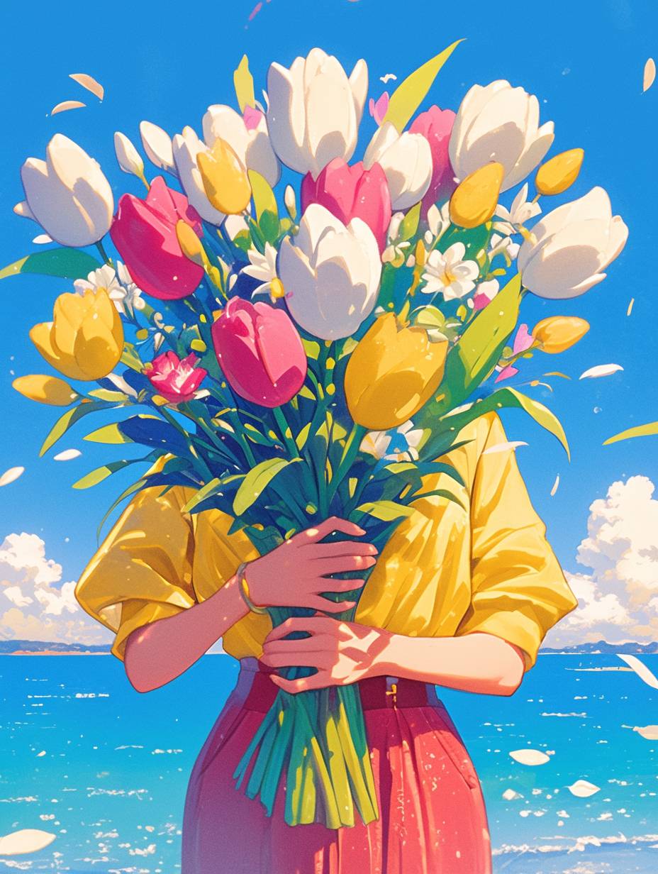 a drawing with One hand held a large bouquet of colorful tulips, seaside, the Haze blue sky background, Giorgio Morandi, retro style, Cool colors, pastel color palette, minimalism, cute artwork, gong bi, Natural light, simple and clean illustration, Korean-style illustration that embodies the current popular fashion trend, by antonio reinhard, --ar 3:4 --stylize 780 --niji 6