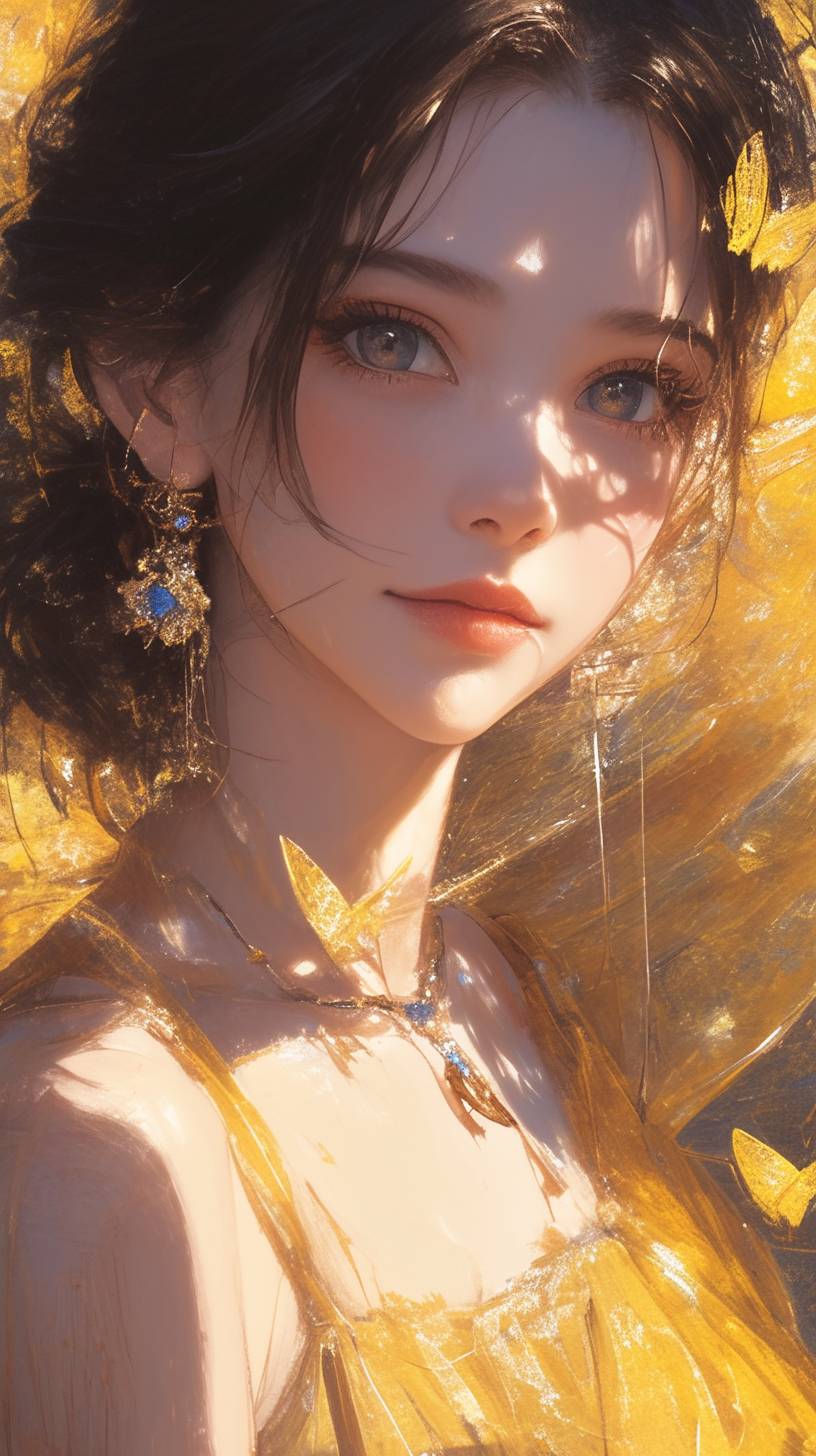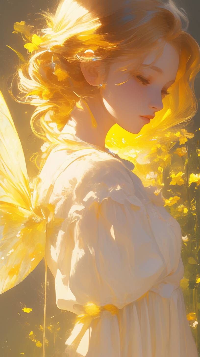 A cute anime-style girl with yellow butterfly wings, simple line art, grey background, and a yellow and white color palette, in the style of Atey Ghailan, with a romantic aesthetic. Anime digital oil painting style --ar 9:16 --stylize 750 --niji 6