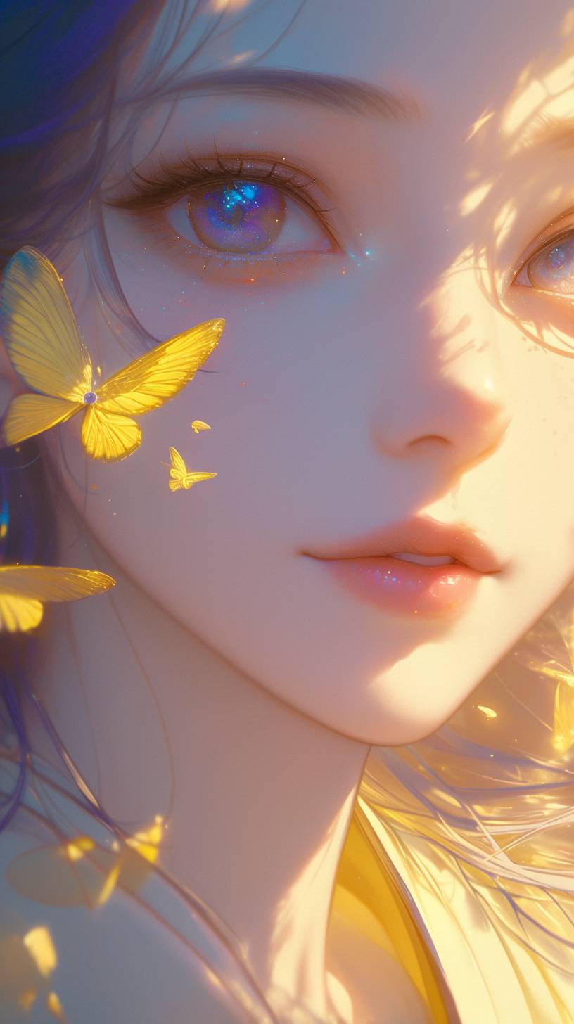 Menina em estilo anime com asas de borboleta amarelas e estética romântica