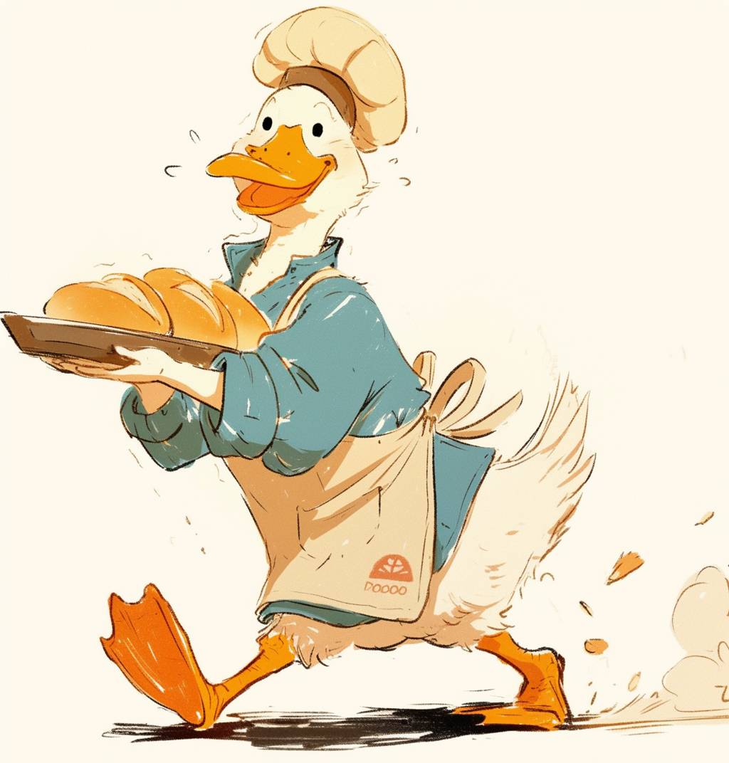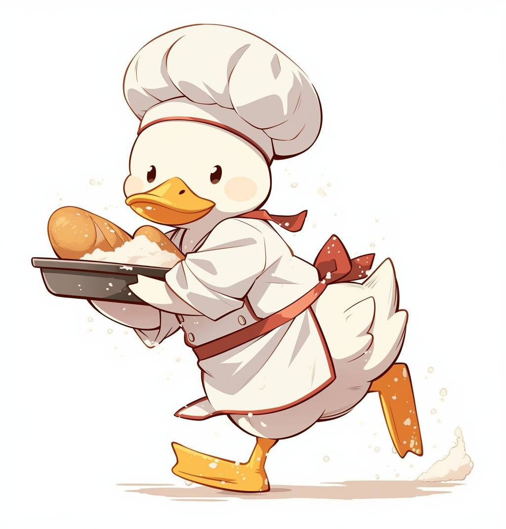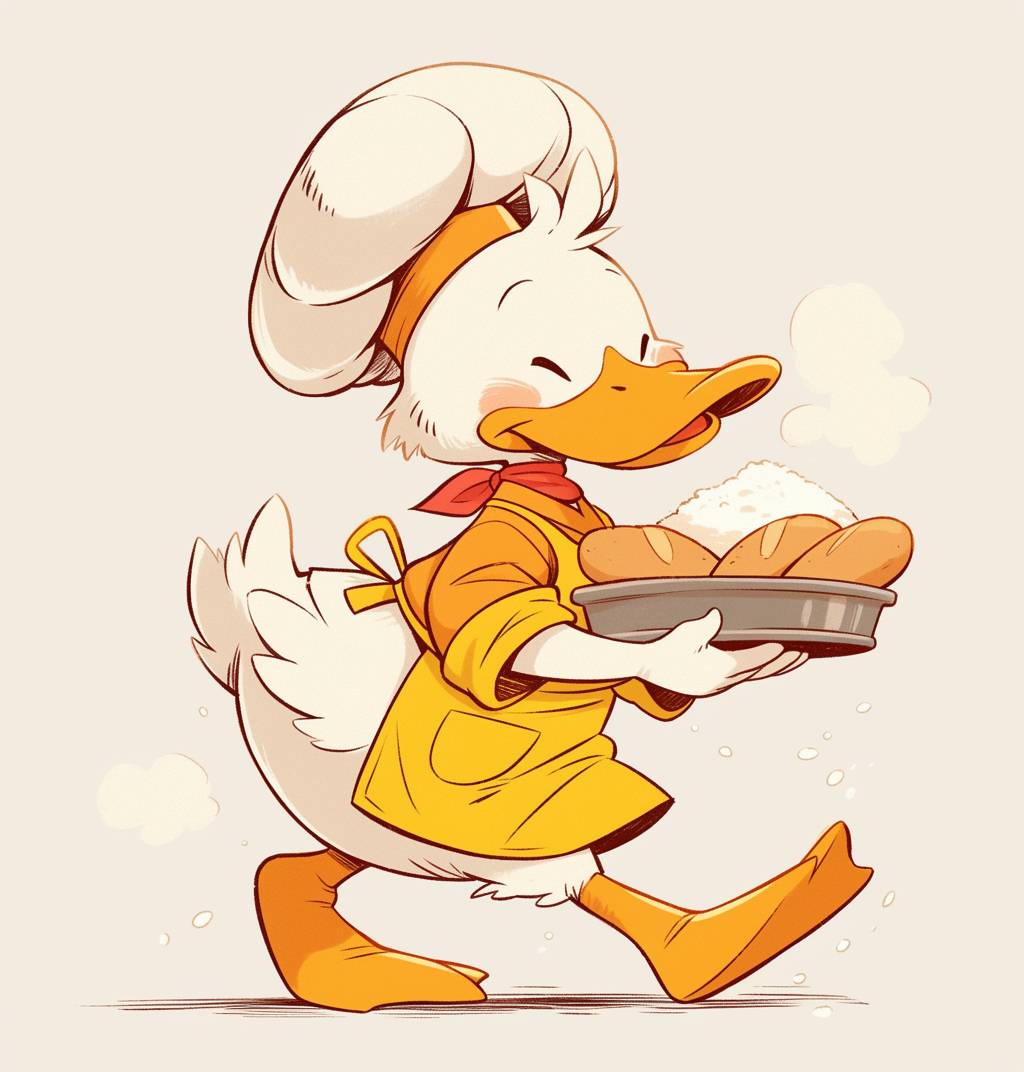 A cartoon white duck wearing a chef's hat and apron, holding a baguette bread in one hand while carrying a platter of loaves of bread with the other foot on its back legs. Vector illustration isolated on a white background, simple line art clipart style drawn in the style of comic book artist Wally Wood. The little goose is running to put on his shoes so he can run fast toward us. Full body view of an anthropomorphic bird as an American house market butler taking away some fresh fluffy white flour from a table. --ar 55:58 --stylize 250 --niji 6