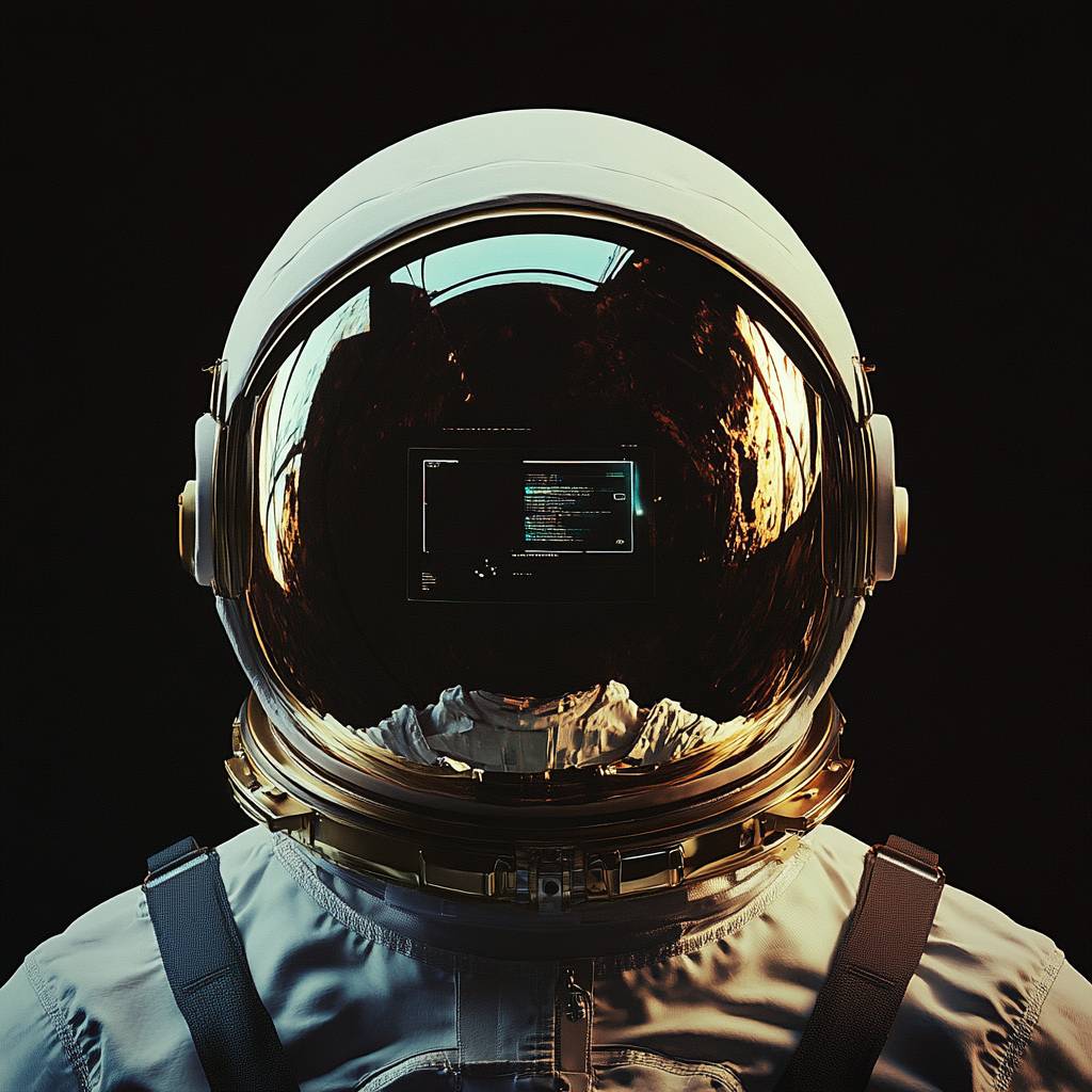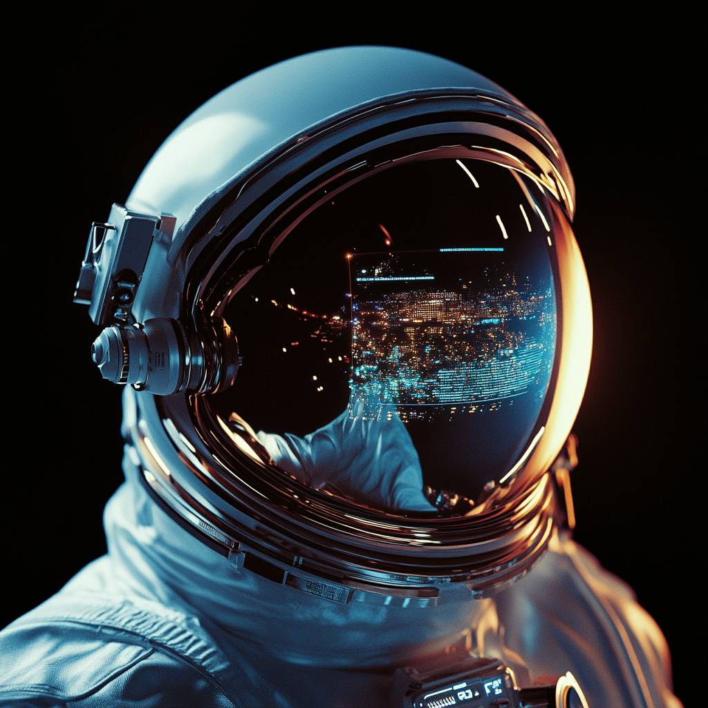 Close-up do capacete de um astronauta com uma tela digital, refletindo o sujeito.
