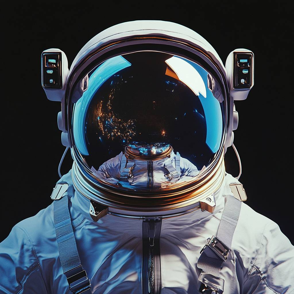 Close-up do capacete de um astronauta com uma tela digital, voltado para a câmera, contra um fundo preto. [ASSUNTO] é refletido na viseira, criando um efeito fotográfico hiper-realista.