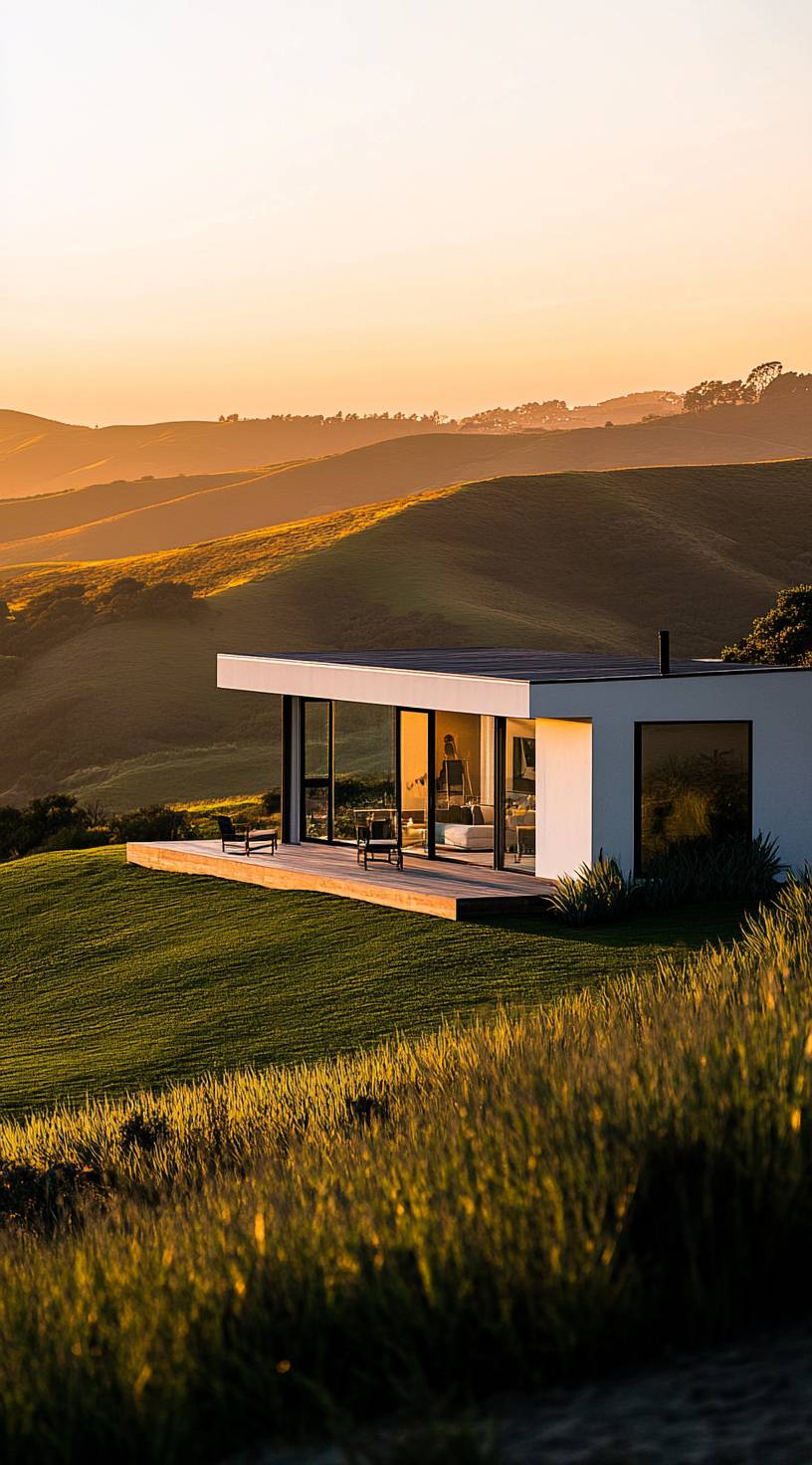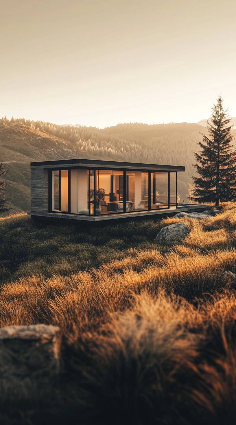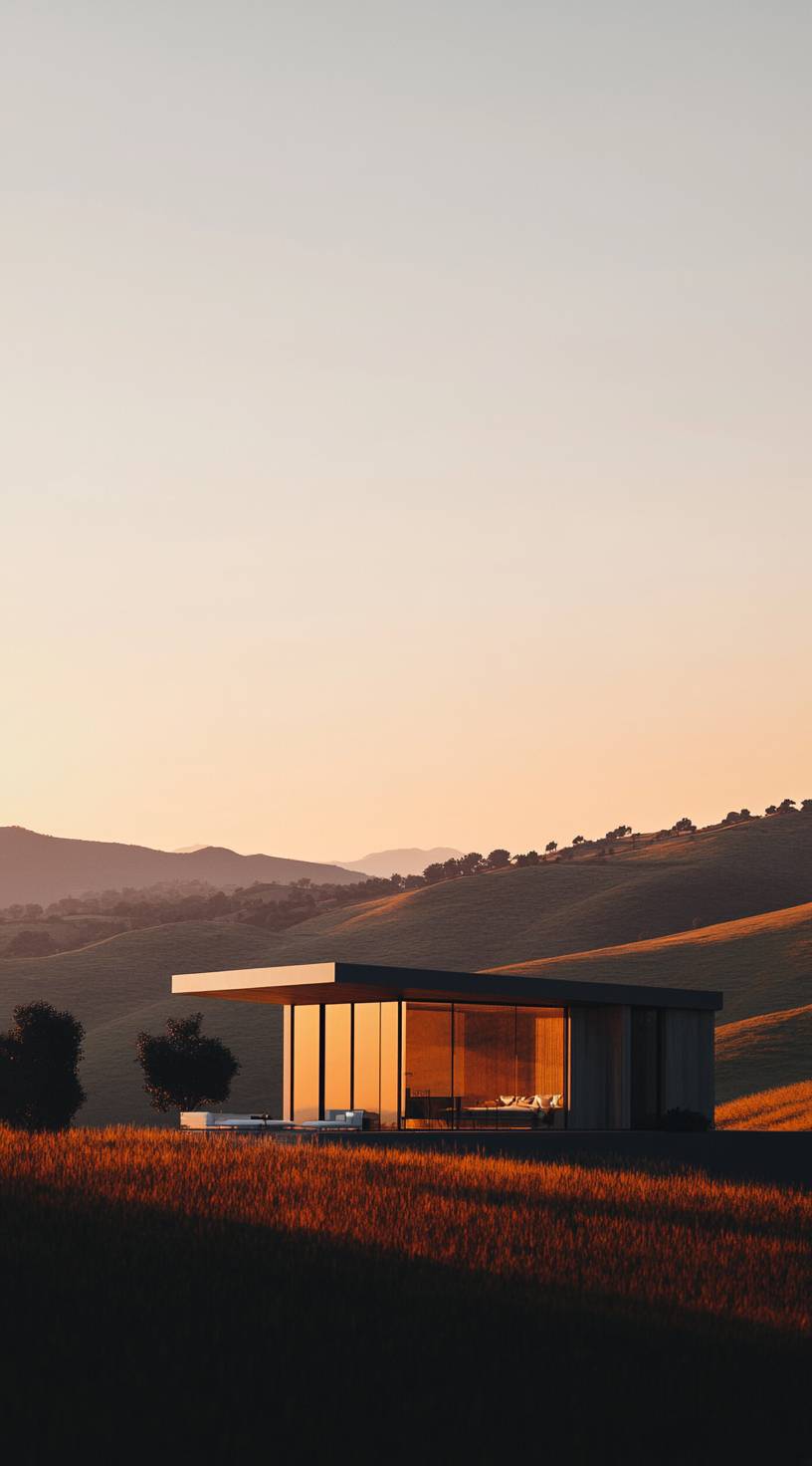 A modern, small house nestled in the middle of rolling hills, featuring a minimalist architectural style with glass windows that capture the golden hour lighting. Captured using a Sony Alpha A7 III, the image has a hyper-realistic quality. --ar 71:128 --stylize 50 --v 6.1
