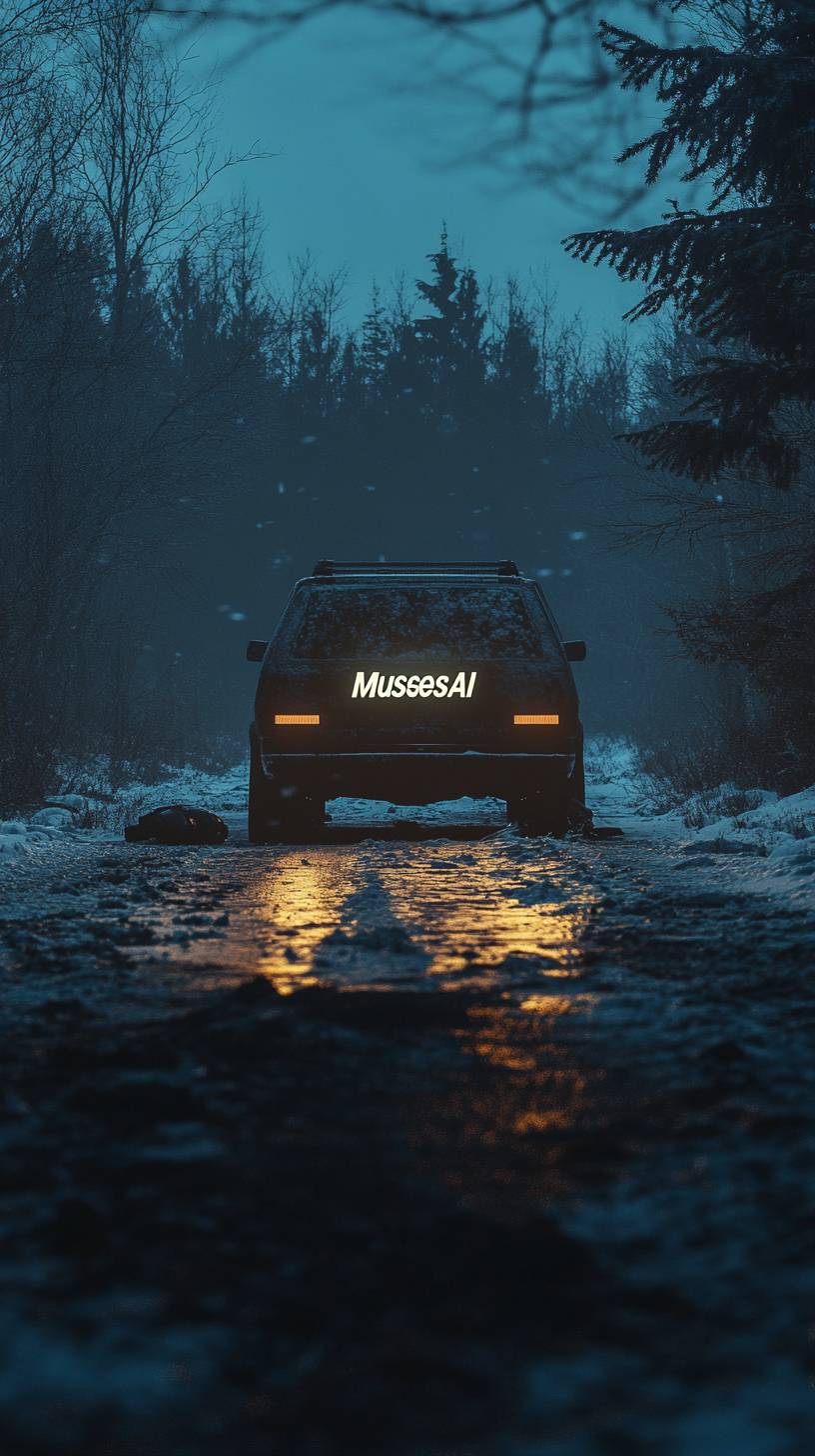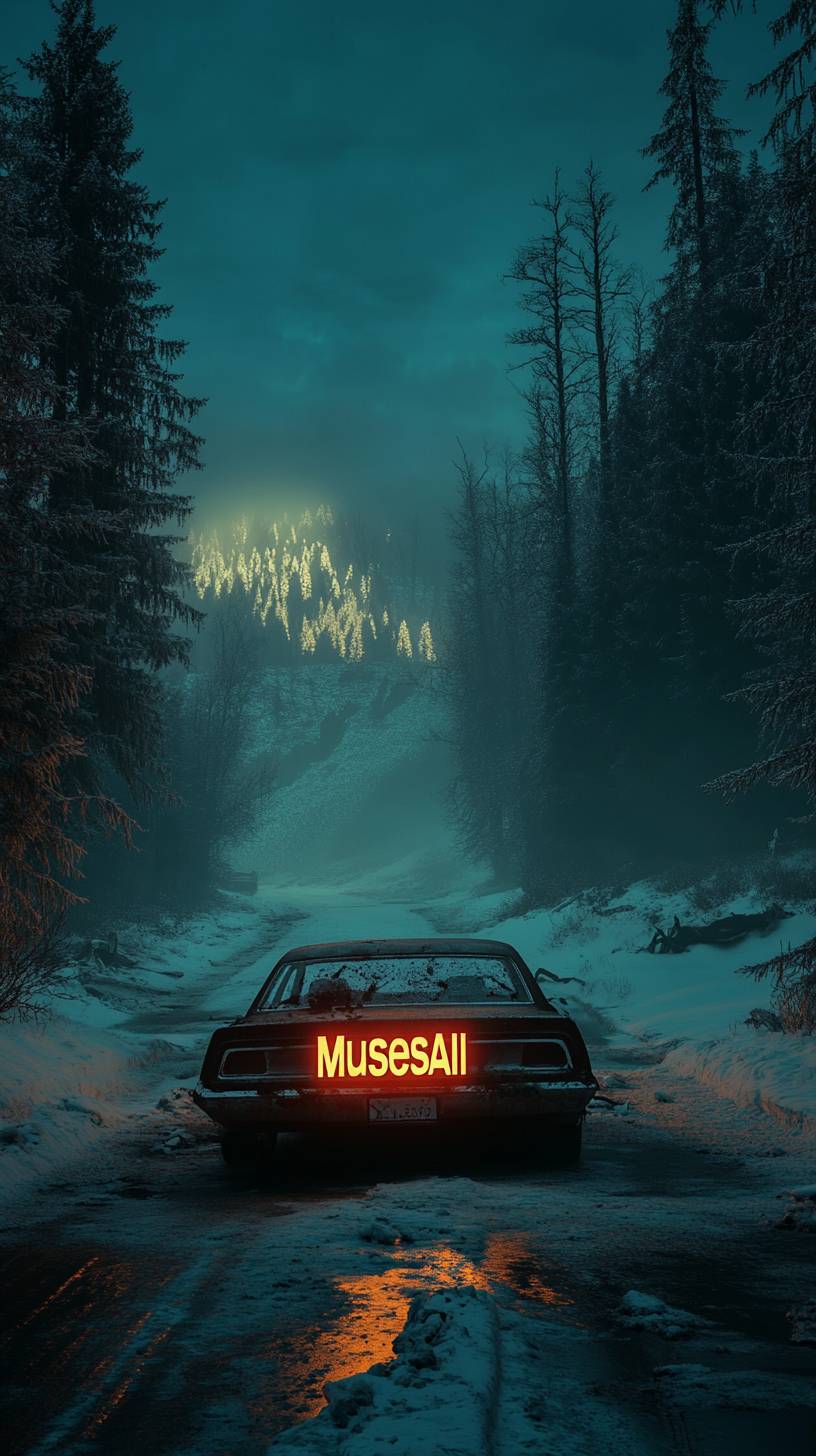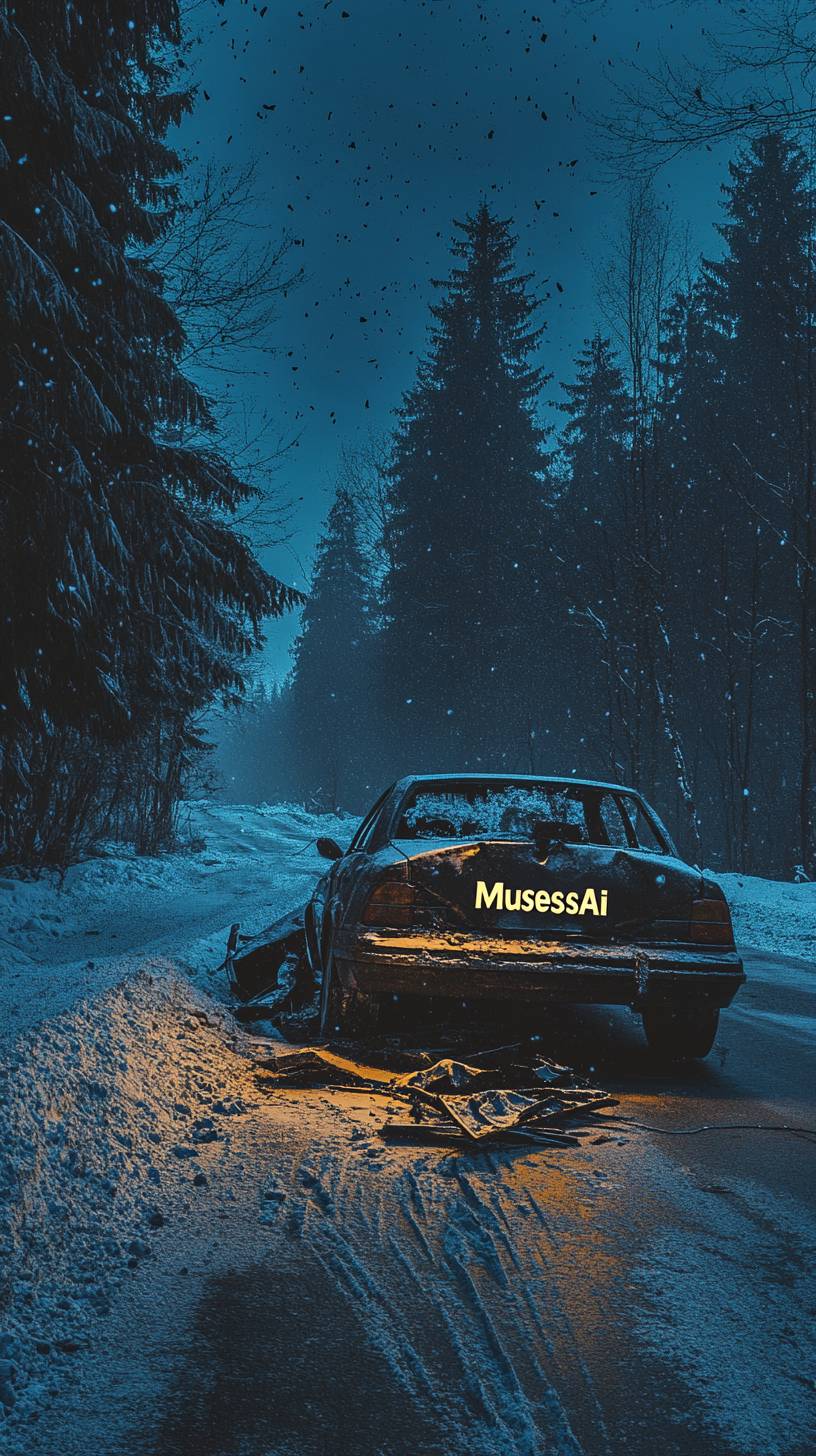 A crashed car on a snowy, desolate road at night, with eerie shadows creeping from the nearby forest. The title "MusesAI" is prominently displayed 2/4 of the way down from the top in bold, gritty font, with a glowing, ominous effect. Cinematography style --ar 9:16 --v 6.1