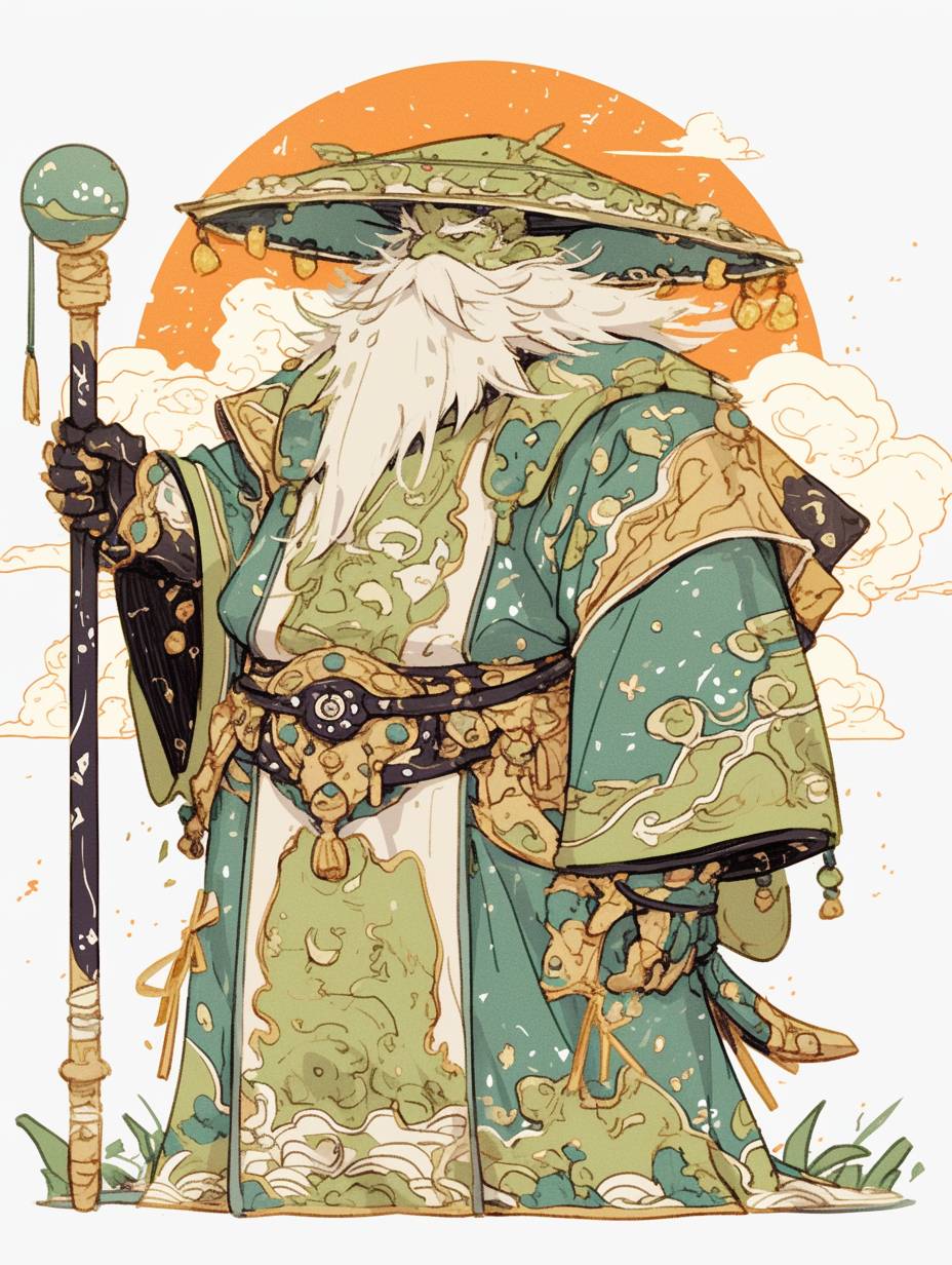 Página de colorir para crianças de um personagem de brinquedo brincalhão em estilo aquarela, com linhas ousadas e alto detalhe. Imagine um esboço com pincel de um homem de kungfu chinês tradicional vestido de seda verde longa, com um Otocolobus manul e uma folha de lótus e a lua. Uma árvore de osmanthus aromático. O personagem é exibido de frente com um design de imagem minimalista preenchido, estilo aquarela, azul e amarelo.