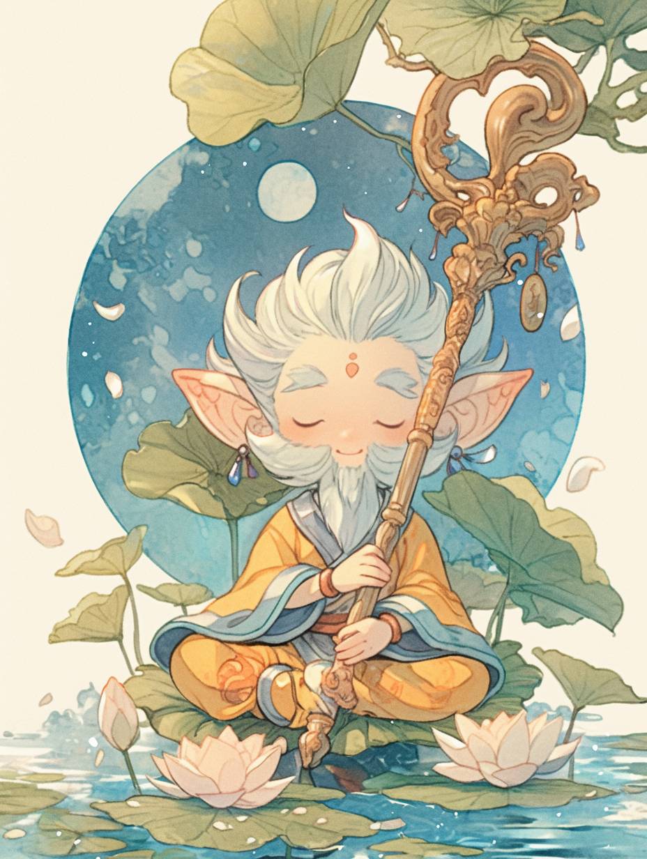 Childrens coloring page of a playful toy character in watercolor style, featuring bold lines, high detail. Envision a writing brush sketch of a tradtional chinese kongfu man Change with long green silk, with Otocolobus manul and lotus leaf and moon. a Sweet scented osmanthus tree,The character is displayed in front view with a minimalist filled image design,water color style,blue and yellow --ar 3:4 --stylize 400 --niji 6