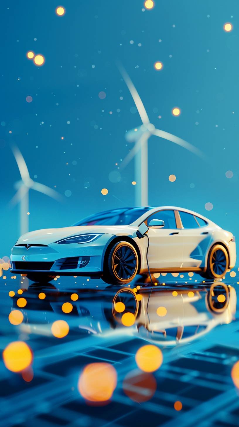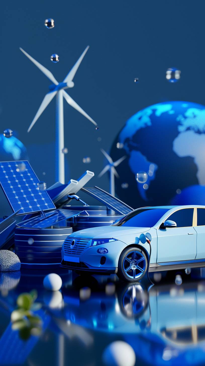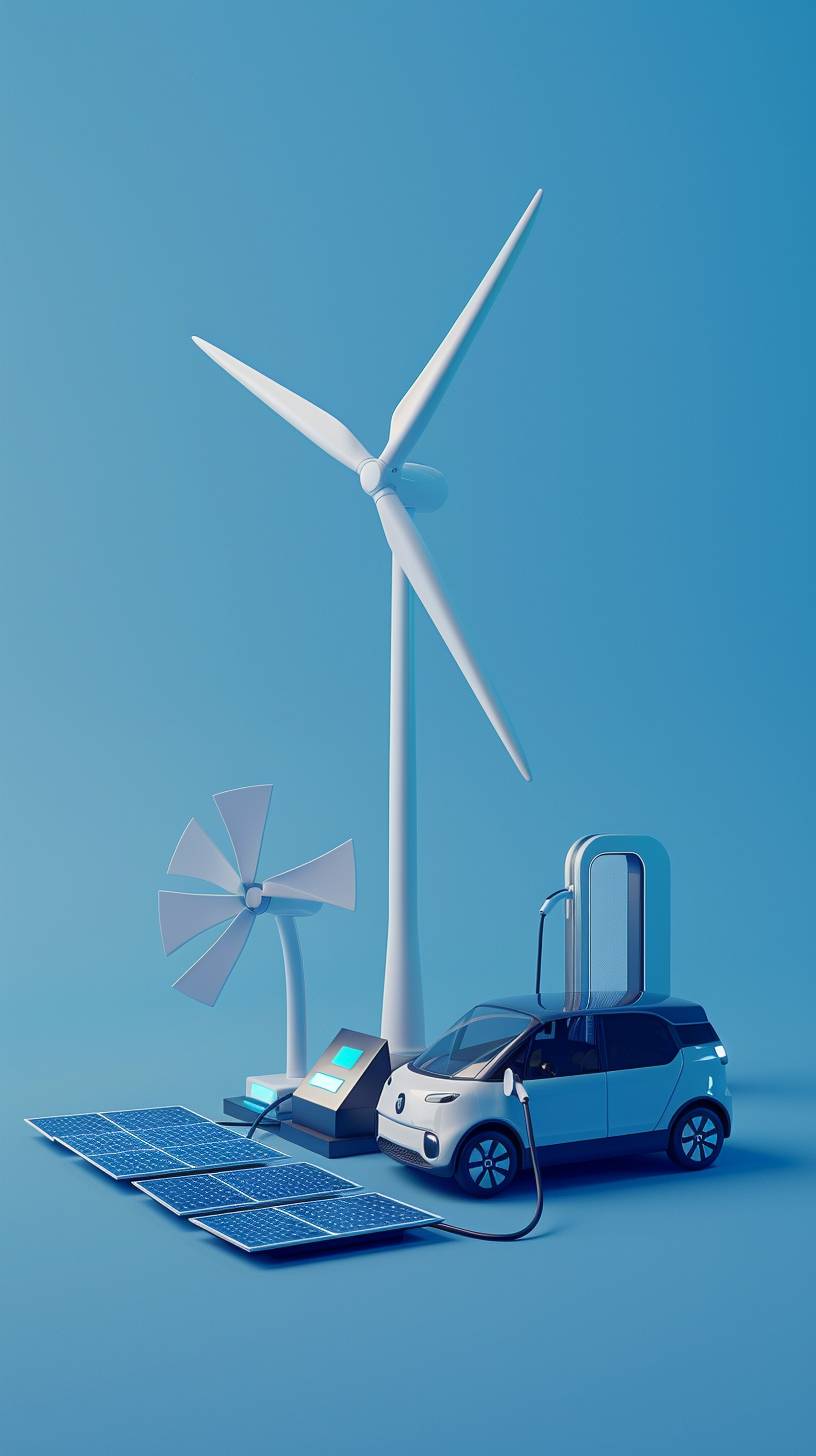 3D stereoscopic, simple, minimalist, technology, outstanding quality, technology industry, new energy vehicles, charging pile, photovoltaic, wind power, hydrogen energy, blue background, environmental protection --no people --ar 9:16 --v 6.0