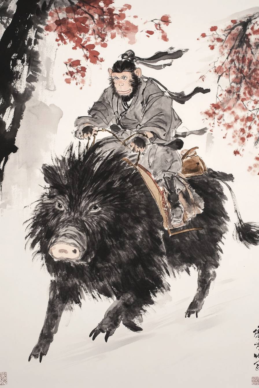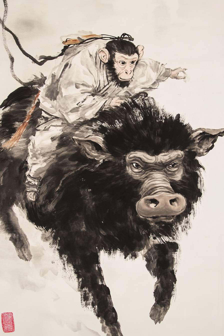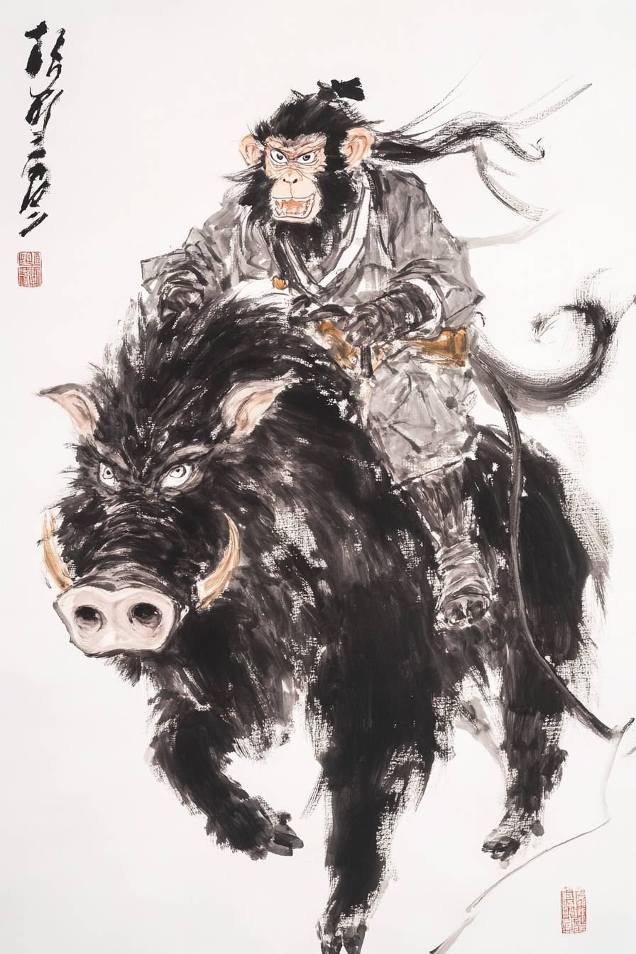 Um macaco montando um javali, pintura a tinta chinesa, fundo branco