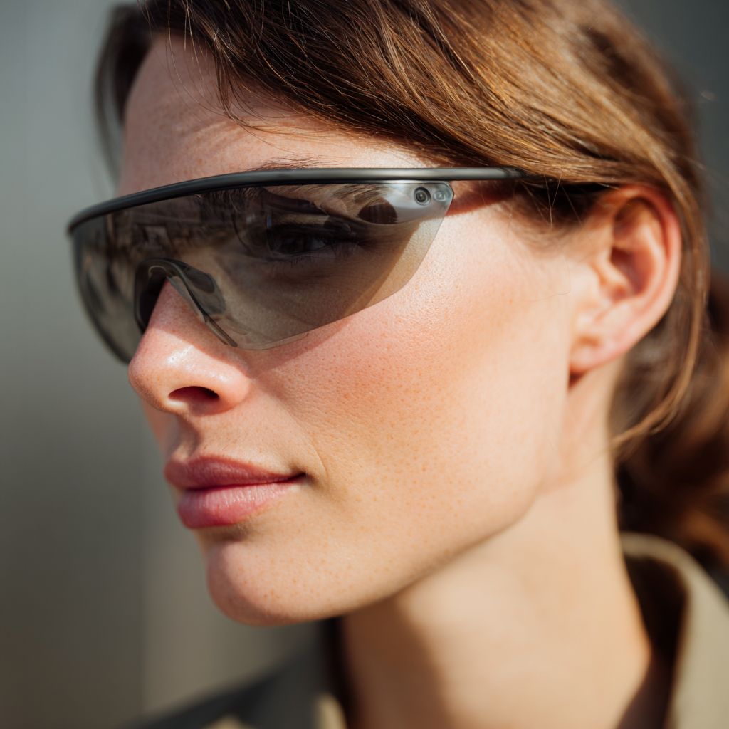Pessoa usando óculos AR, retrato de estilo de vida natural, ambiente urbano moderno, os óculos parecem óculos de sol normais, não um fone de ouvido, armação fina e minimalista, proporções leves, sem câmeras visíveis, sem eletrônicos volumosos, informações AR sutis mal visíveis na borda inferior da lente, sem hologramas, sem interface flutuante, estilo de moda limpo, roupa neutra, proporções humanas realistas e textura de pele, foco no conforto, ajuste e realismo, profundidade de campo cinematográfica, luz natural suave, estética de eletrônicos de consumo premium, fotografia de design industrial de alta qualidade, apresentação estilo Behance, ultra-realista, ultra-detalhada, não é ficção científica, nem traje futurista