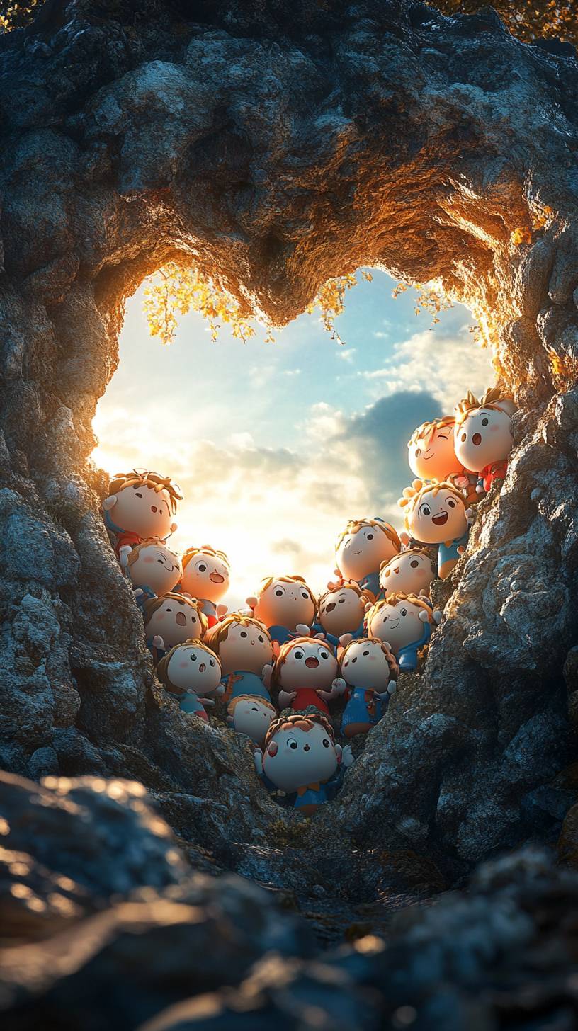 Сердцевидное отверстие в скальном стене заполнено комиксными персонажами из Крейон Синчана, включая Lstag и Sbooropan. У всех на лицах радостные выражения, и они смотрят на меня через трещины. Фон выполнен в небесно-голубых и коричневых оттенках, создавая атмосферу радости. Эта сцена была создана с помощью программного обеспечения C4D для анимации в стиле аниме, используя традиционные японские живописные техники для захвата тонких деталей и текстур.