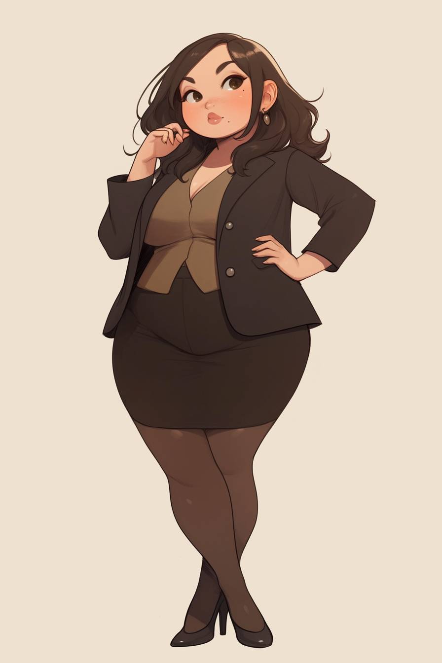 Мультяшный стиль, китайская женщина, полная, полный рост, тёмно-коричневые волосы, родинка на левом щеке, параллельные брови, круглые глаза, в костюме, пастельные цвета