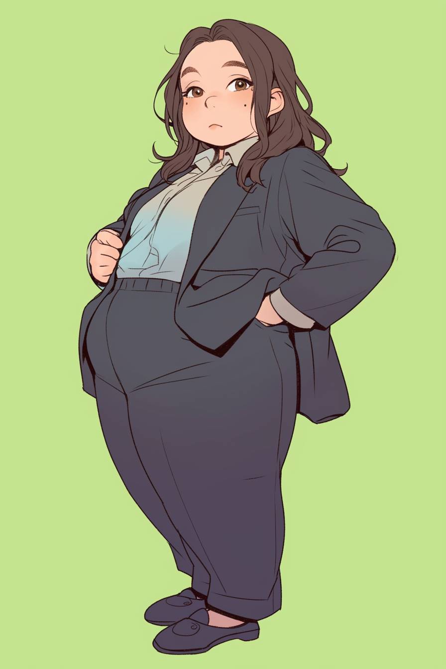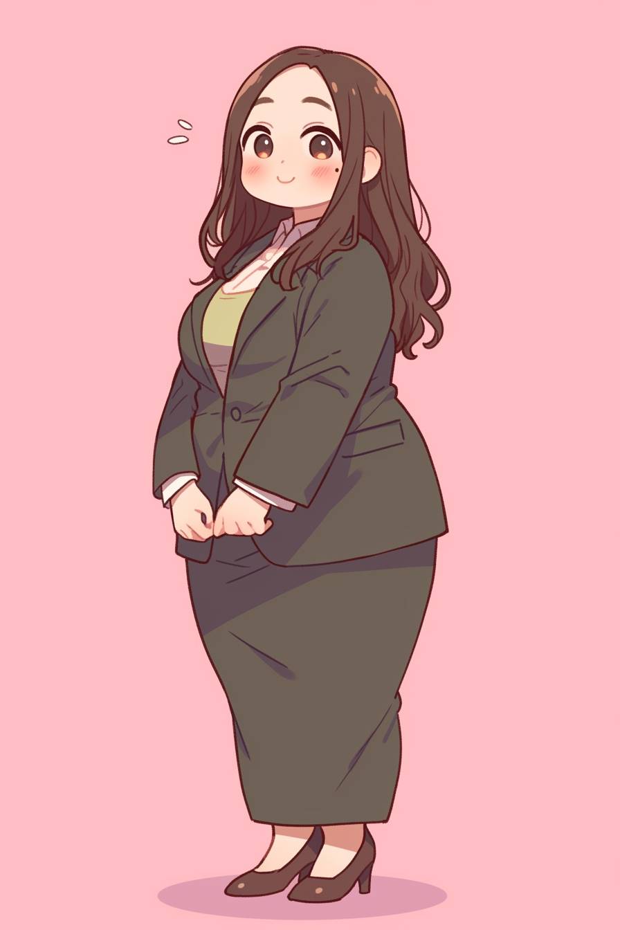 Cartoon style, chinese female, chubby, full body shot, dark brown hair, mole on left cheek, parallel eyebrows, round eyes, wearing suit, pastel colors --niji 6 --ar 2:3