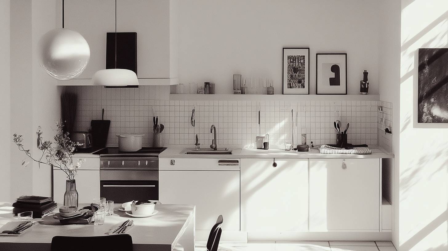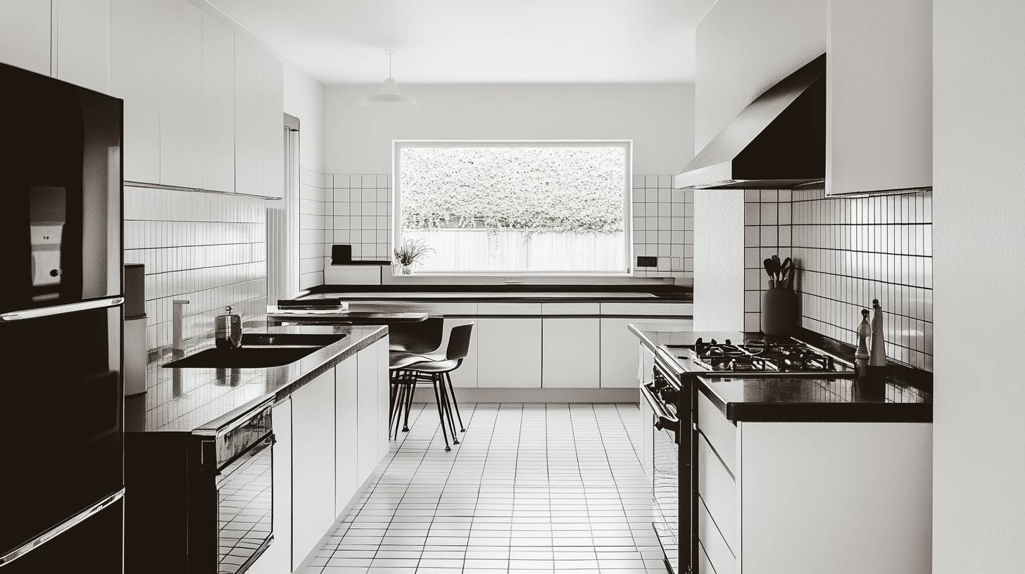 editorial photography of an average kitchen, full kitchen view, suburban home, bright crisp light, 35mm dslr, high precision photo --ar 16:9 --sref 1903042966 --v 6.1