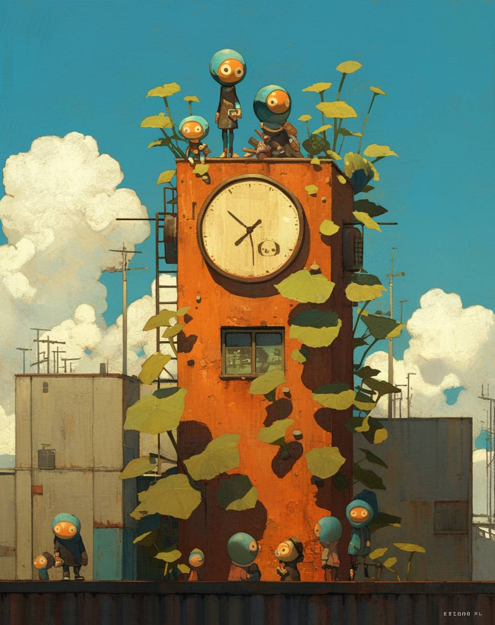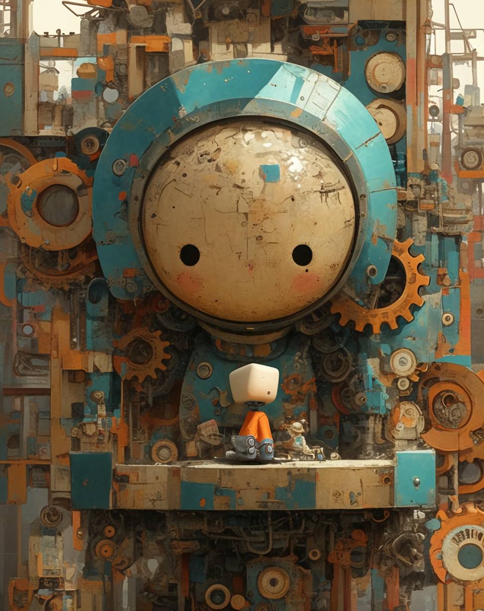 Nicoletta Ceccoli style, grooming a circular bearing plant on top of a mini rusty colorful robots , hard working bots, colorful, showing the working bots --ar 61:77 --stylize 400 --niji 6
