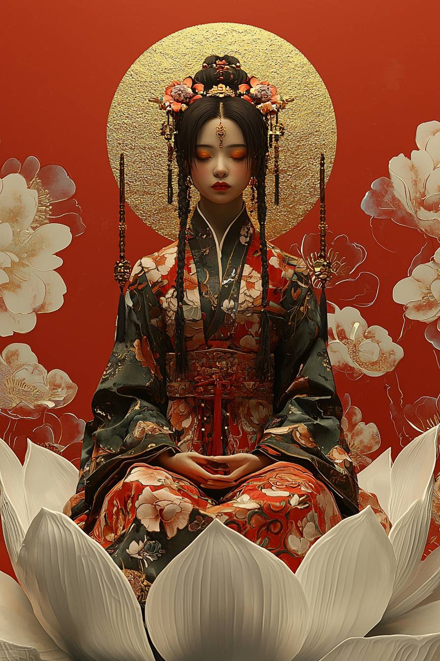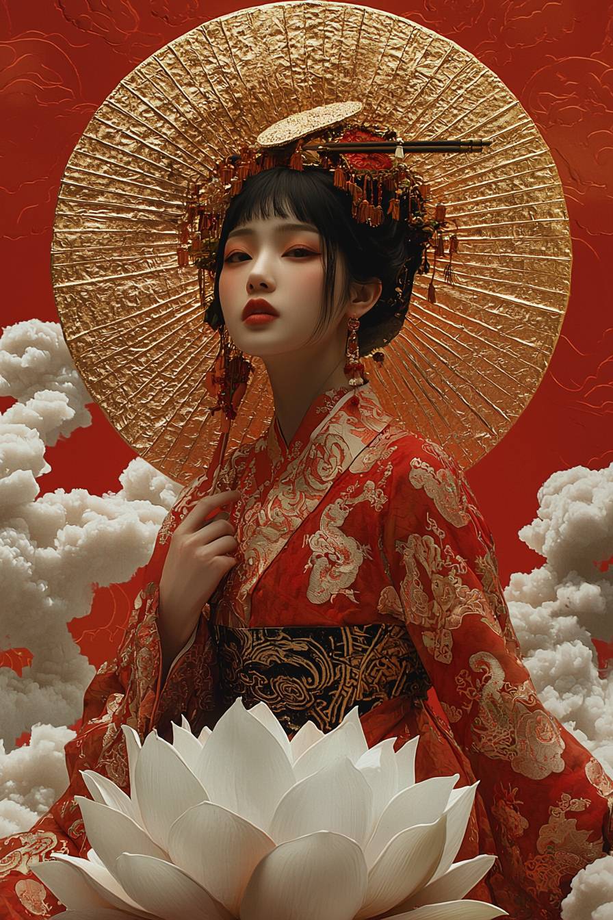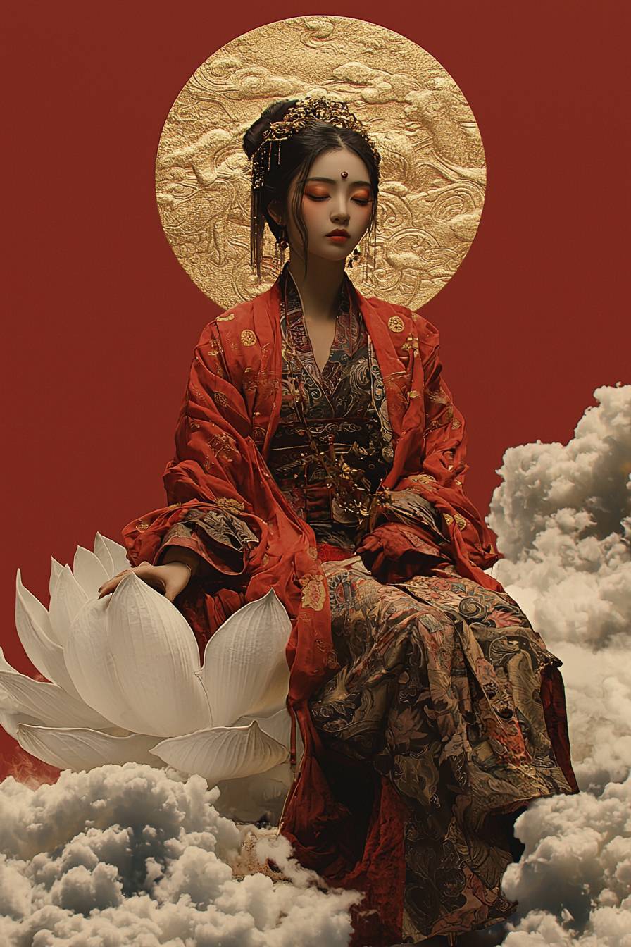 Студийная фотография, искусственное освещение на лице модели, портрет в полный рост, китайская модель сидит на гигантском белом лотосе с нимбом над головой, на фоне морской облачности, золотой нимб света вокруг ее лица, разноцветные радужные облака вокруг, изображая свет и тень.