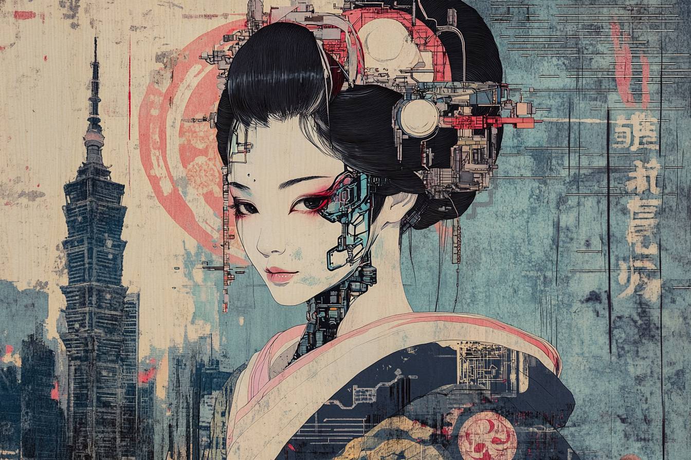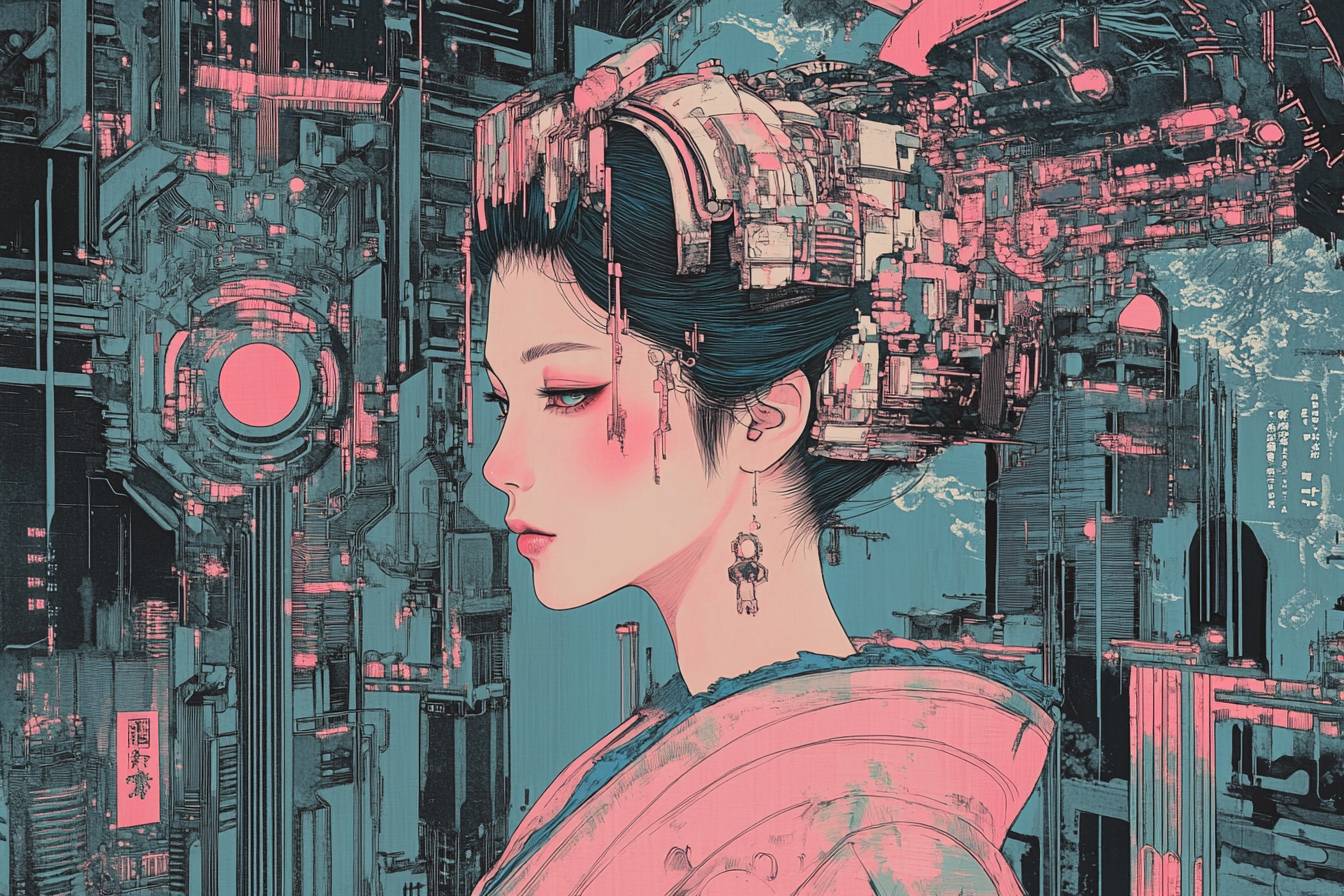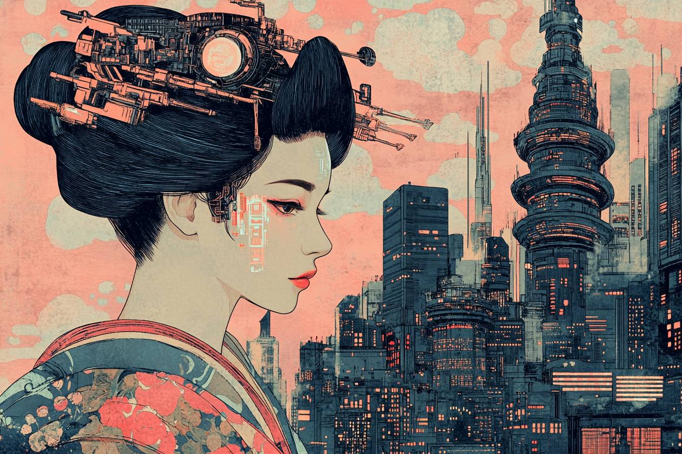Киберпанковская укиё-э гравюра с гейшей с кибернетическими имплантами. Она сочетает традиционный японский стиль с футуристическими элементами, такими как кибернетика, голограммы и высотные мегаполисы. Использует ограниченную цветовую палитру, вдохновленную классическими гравюрами укиё-э: индиго, бледно-розовый и металлический серебряный.