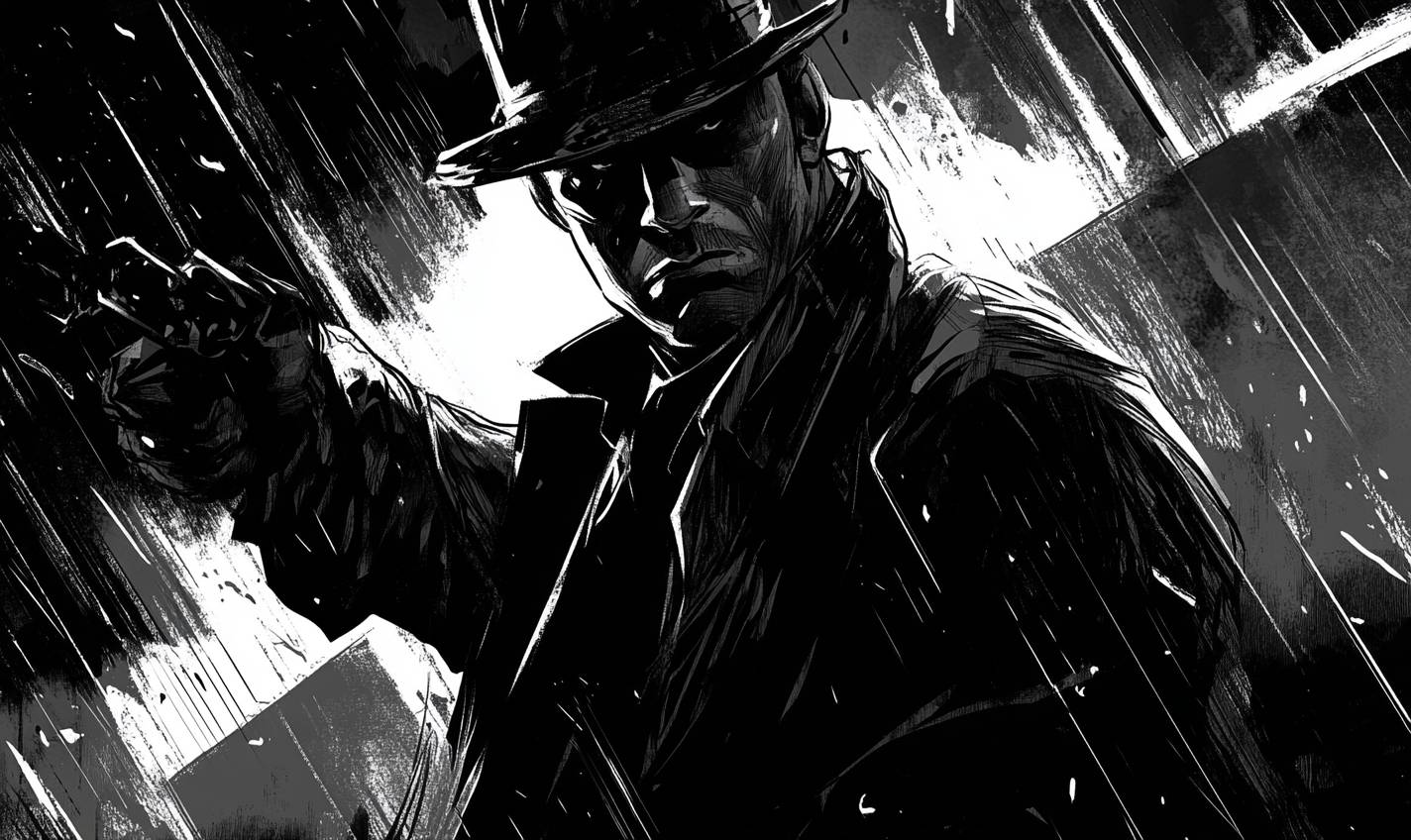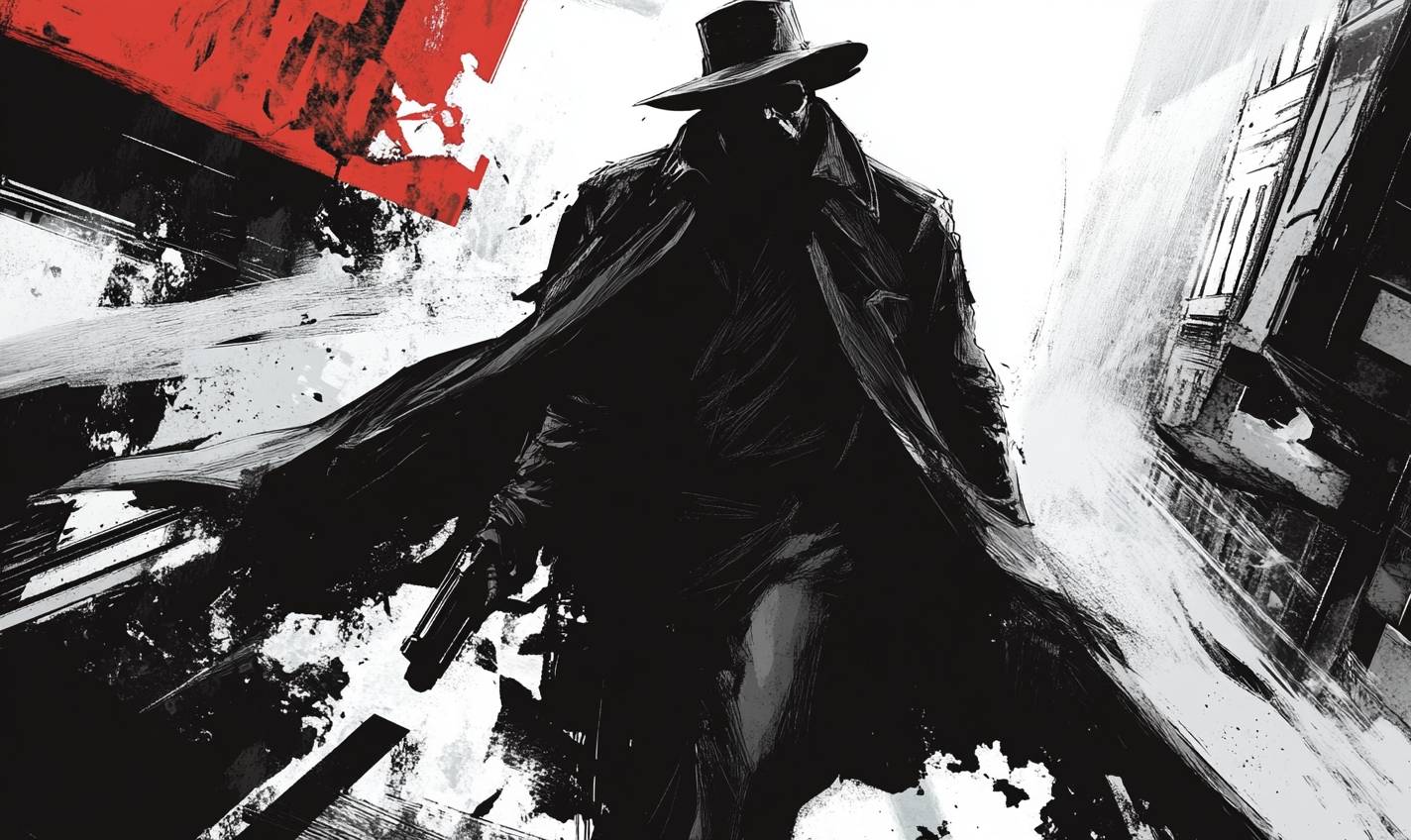 Design [SUBJECT] in the style of a Neo-Noir Graphic Novel, with sharp lines, high contrast, and gritty textures. Employ a black and white foundation, punctuated by strategic splashes of [COLOR1] and [COLOR2] to highlight key elements --v 6.1 --ar 5:3