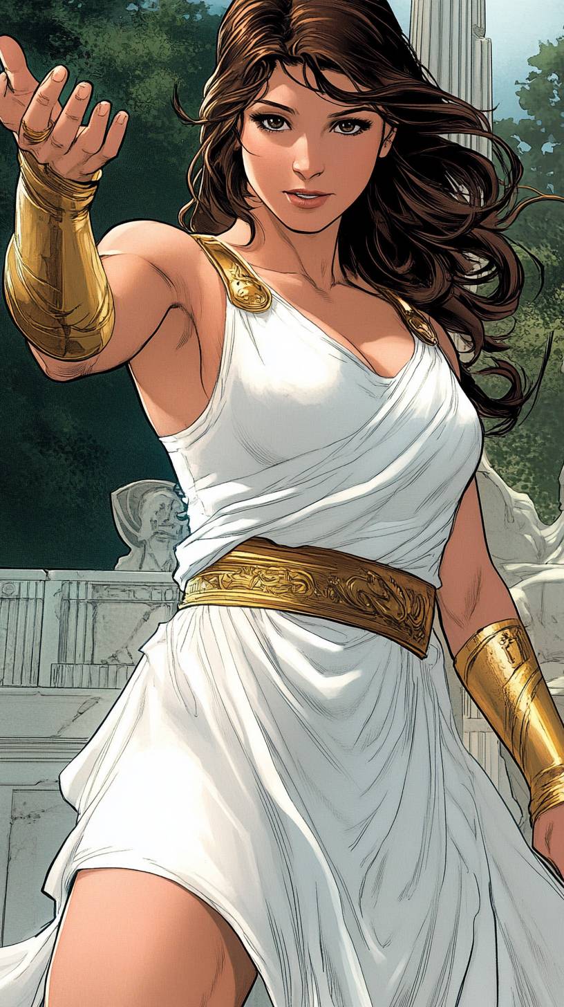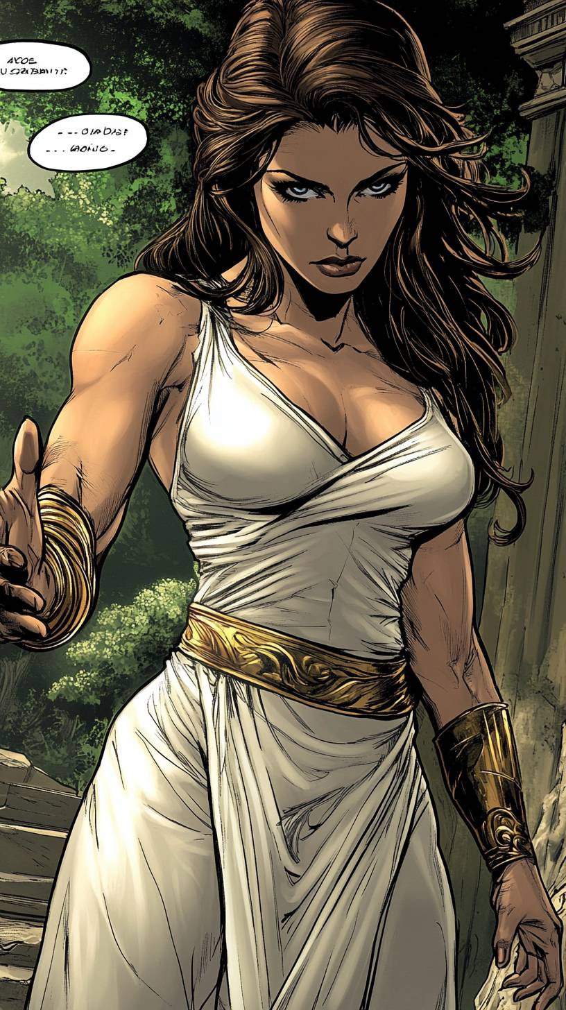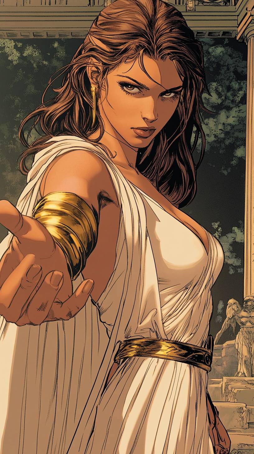 a comic book panel of an attractive muscular woman with long brown hair wearing white ancient Greek robes and gold arm sleeve, she is holding out her hand to gesture towards the viewer as if showing them something in front or behind her, there’s text on top that says "acto --ar 9:16 --v 6.1