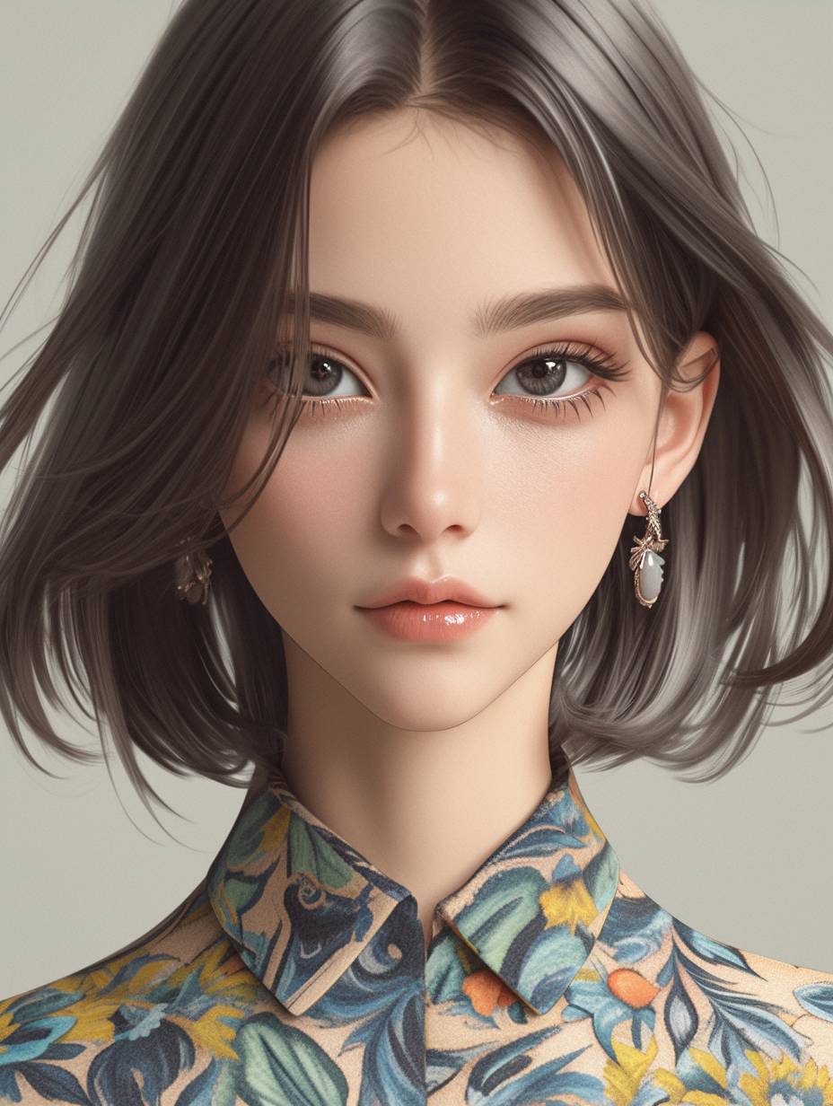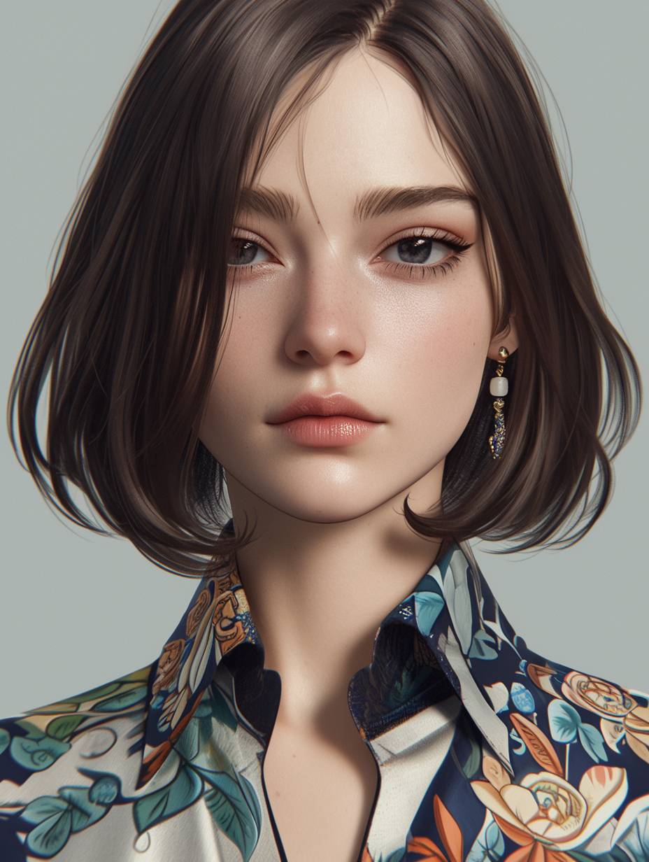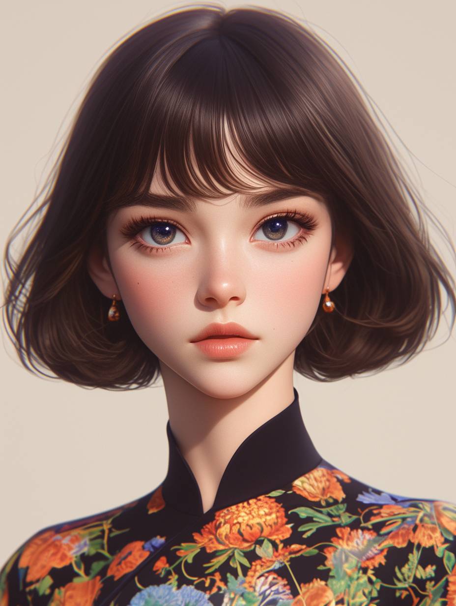 "Hyperrealistic 3d nft of an elegant Eastern woman with smooth, exaggerated features. She has big, expressive almond-shaped eyes, a small nose, and a soft smile. Her hair is styled in a sleek, dark bob, and she is wearing a traditional silk dress in bright, bold colors with intricate patterns. The overall style is inspired by 2D animation, with soft shading and bold outlines. The background is a simple, pastel-colored gradient with light floral elements to complement the character. The mood is cheerful and elegant, with a whimsical, playful tone. --ar 3:4 --stylize 750 --niji 6